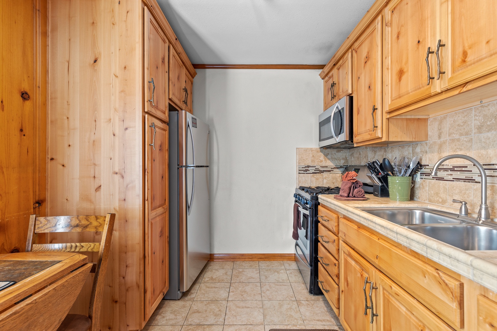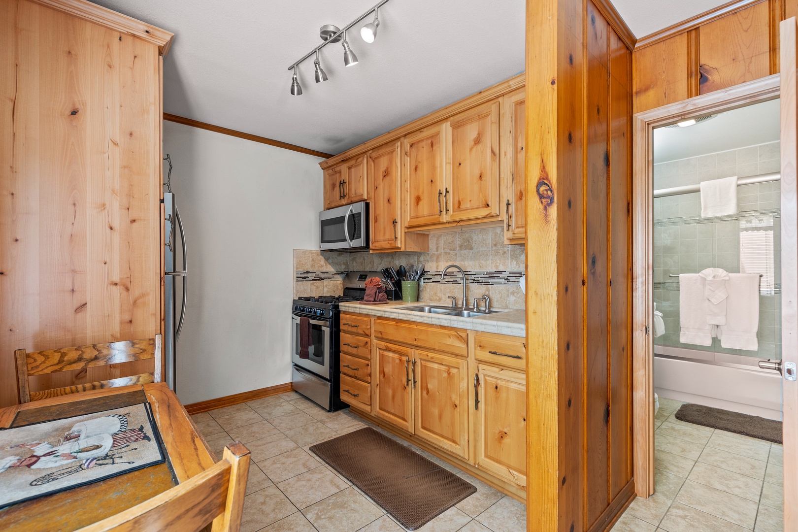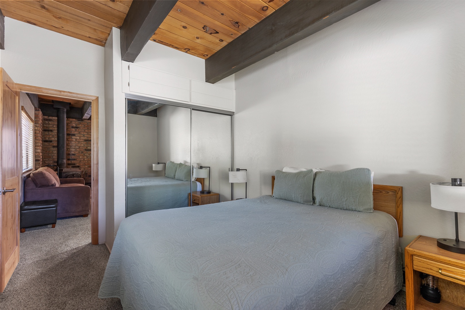 Another room with a queen bed is accessible from the living room. Just a few steps up, you'll find the fully equipped kitchen and two full bathrooms for your convenience.