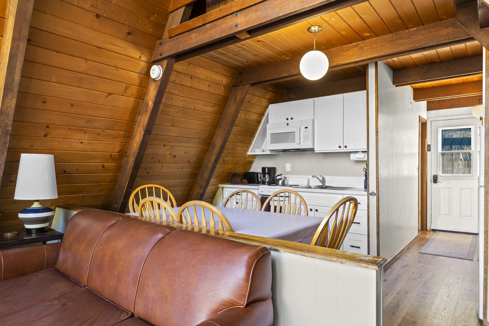 As you step inside these cozy cabins, you'll immediately sense the warmth and comfort of a true home away from home. On your left, you'll find a welcoming bedroom with a queen bed. Moving forward, the space opens up into a combined living area that seamlessly integrates the kitchen, dining tables, and a comfortable living room.
