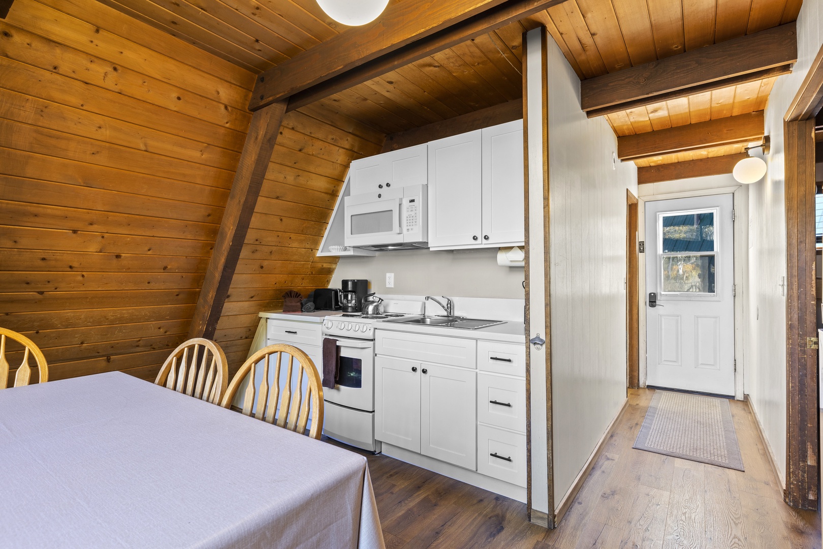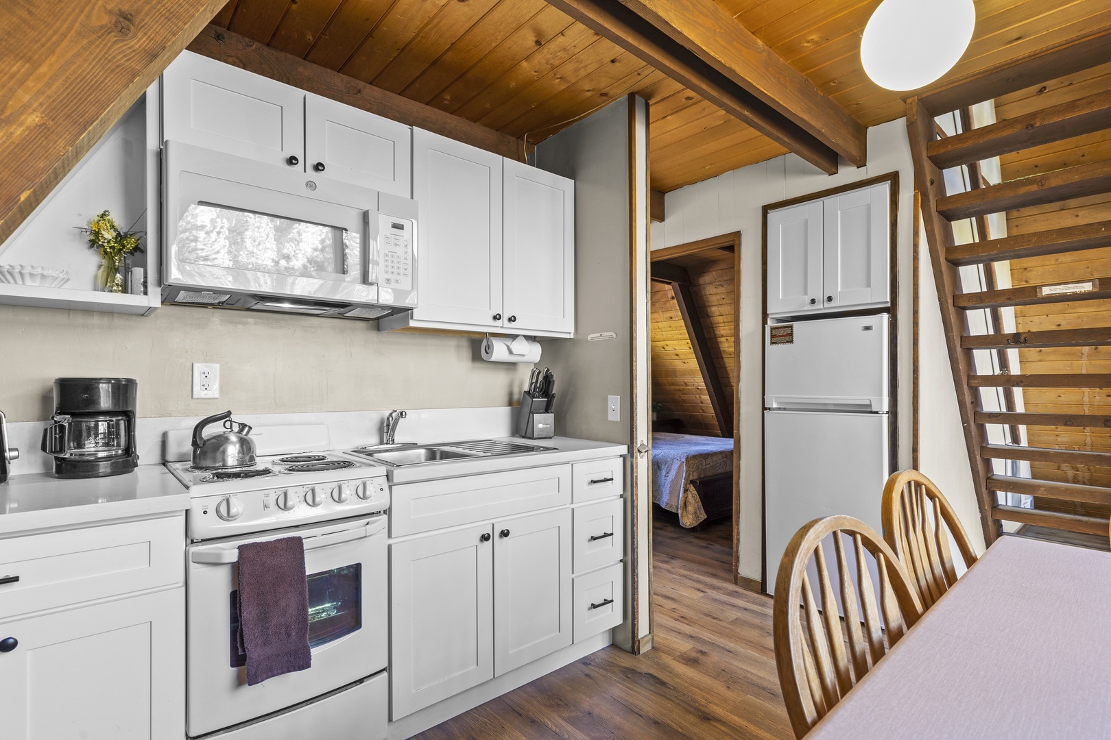 Our family completely enjoyed our stay. The beds were comfortable, the kitchen had most of what we needed (we always cook our own meals so we usually bring along items that arent typically found in rentals), and the property location was perfect for us. The only warning I would give to someone else is the stairs to the loft arent of standard rake. Theyre steeper and the tread is narrower; more of a ladder than stairs. Be cautious, especially going down at 4am when your dog starts barking at the deer at the back door 😉