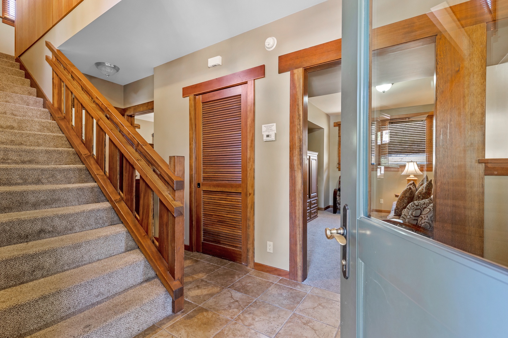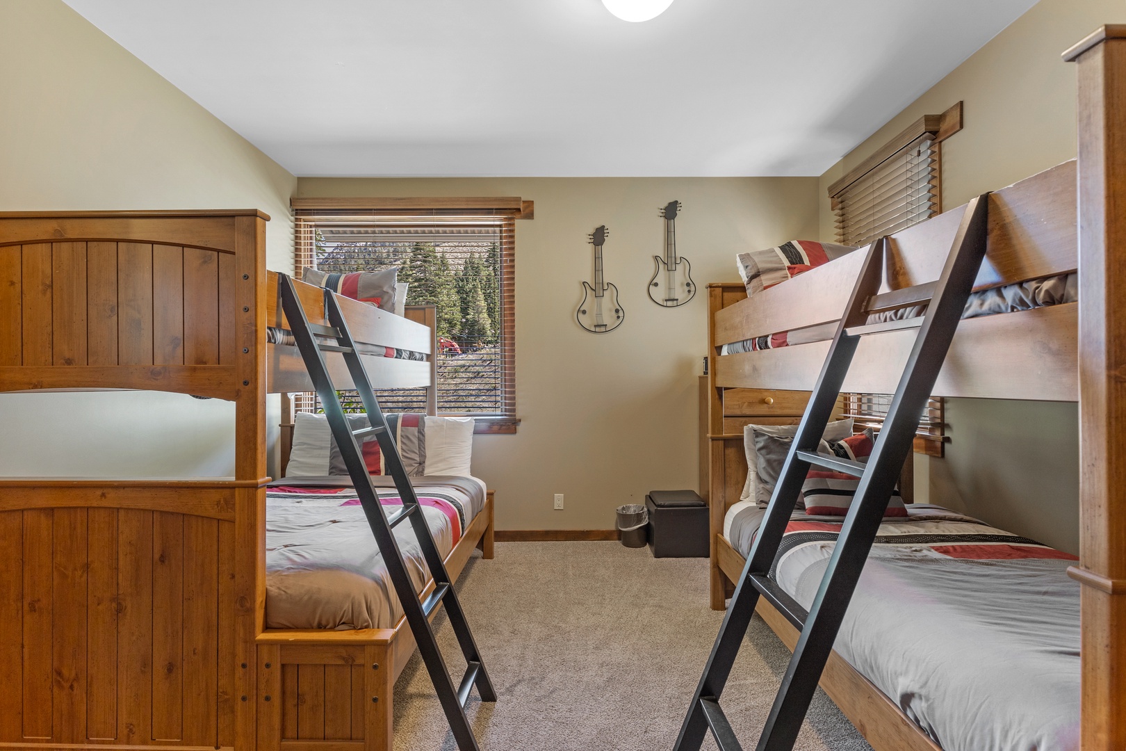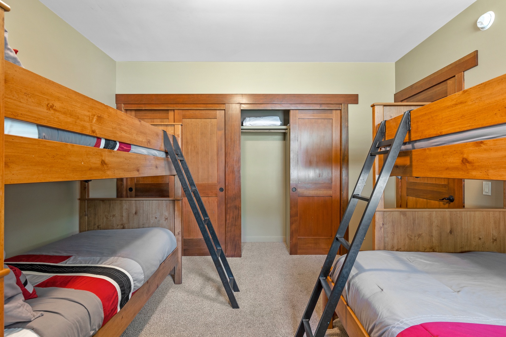 To the right of the entryway is the first bedroom, featuring a queen bed, a fully attached bathroom, a walk-in closet, and a 22” flat-screen TV. The other room on this entry level is perfect for kids, offering three twin beds and a double bed. There's also another full bathroom nearby, along with a closet that houses a washer and dryer for added convenience.
