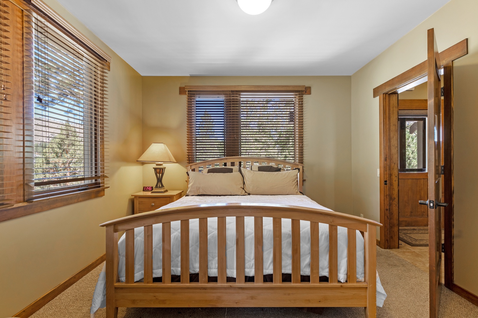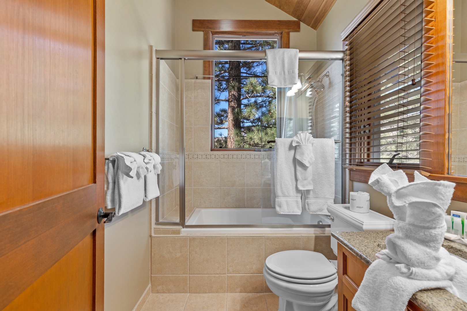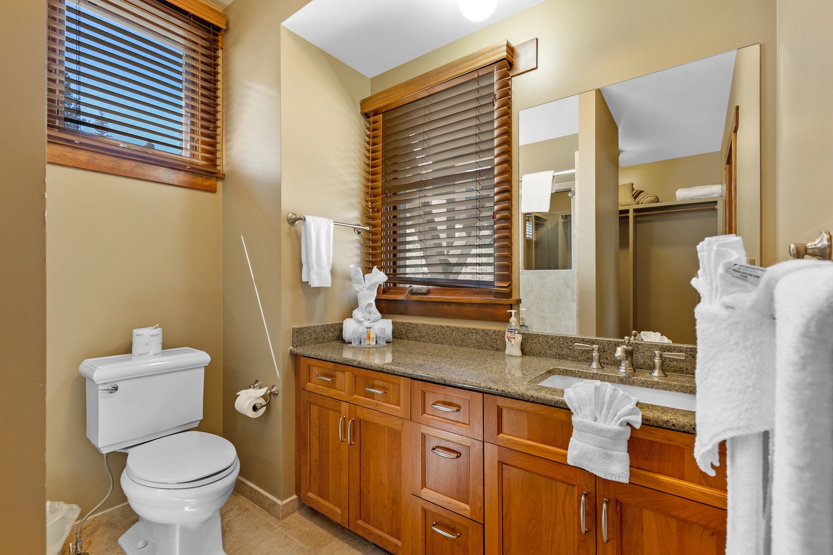 To the right of the entryway is the first bedroom, featuring a queen bed, a fully attached bathroom, a walk-in closet, and a 22” flat-screen TV. The other room on this entry level is perfect for kids, offering three twin beds and a double bed. There's also another full bathroom nearby, along with a closet that houses a washer and dryer for added convenience.