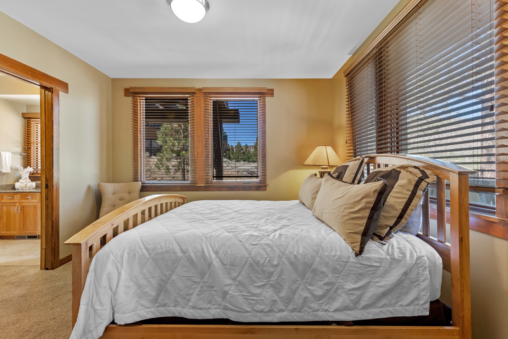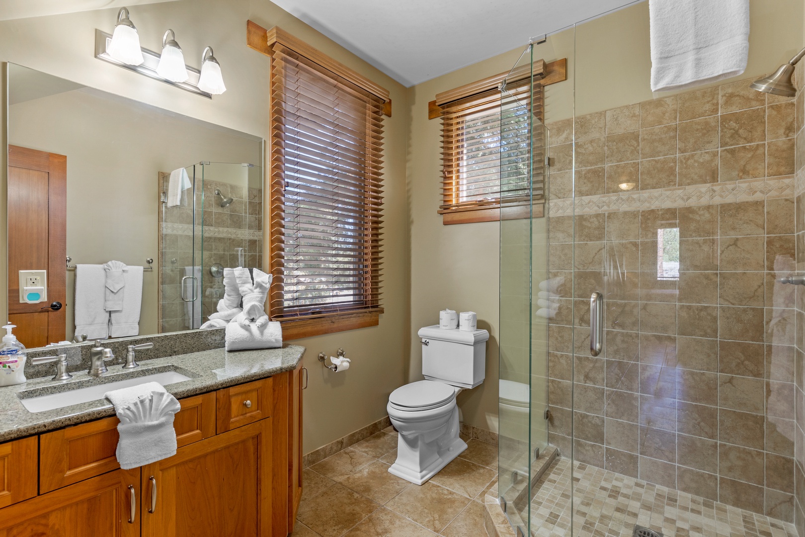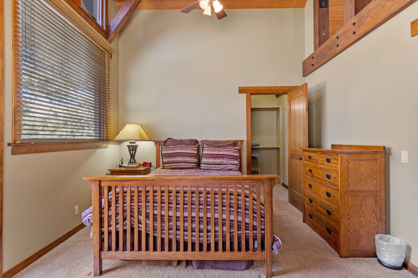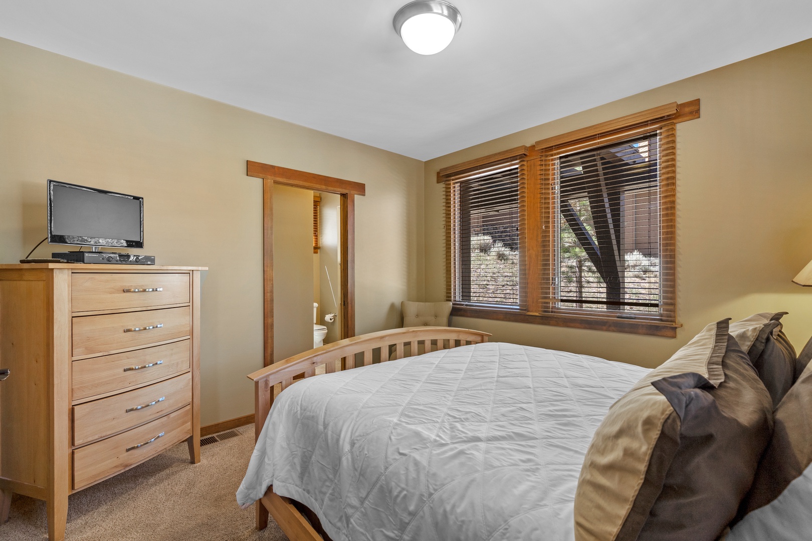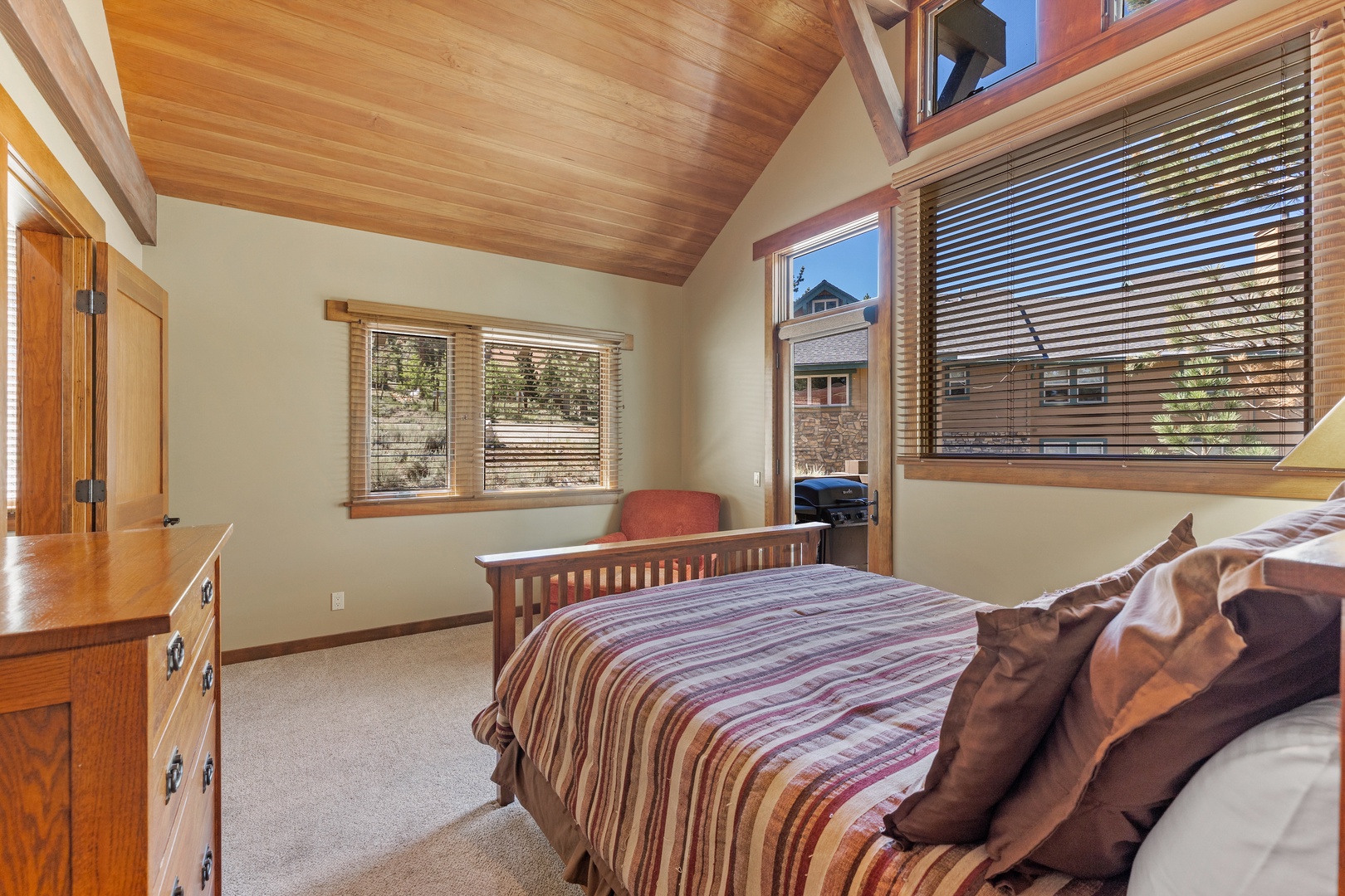The modern kitchen is fully equipped and ready for your culinary adventures. Off of this room, you'll find another master bedroom with a queen bed and an attached bathroom. There's even a small balcony attached to this room, allowing you to step outside and enjoy the fresh mountain air.