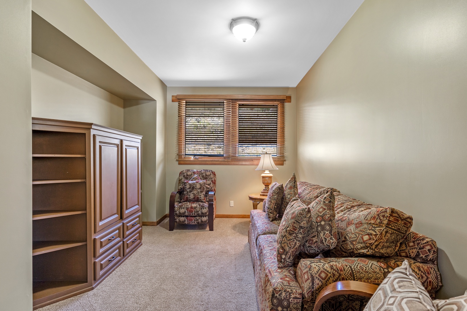 Upon entering this custom home, you'll be greeted by a spacious entryway that leads to two rooms and a den. The den is thoughtfully designed with ample seating and a 36” flat-screen TV equipped with a DVD player for entertainment.