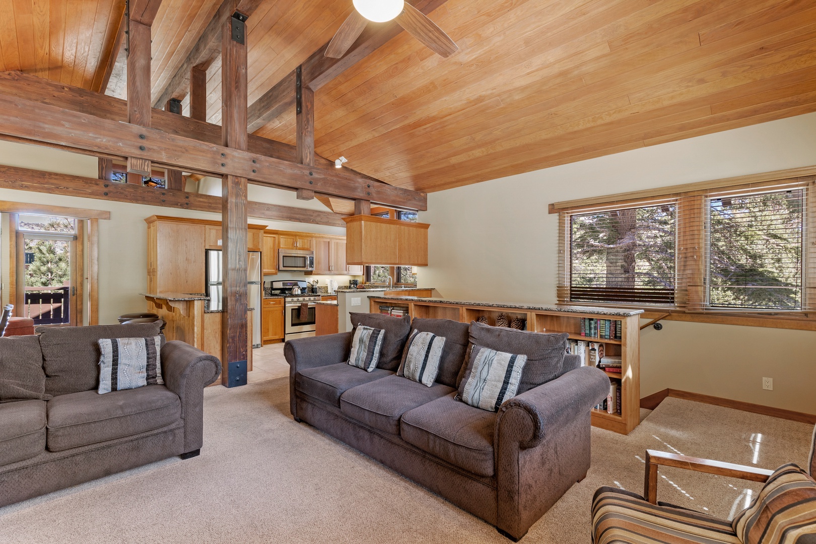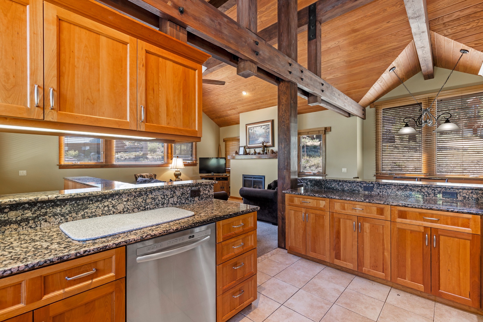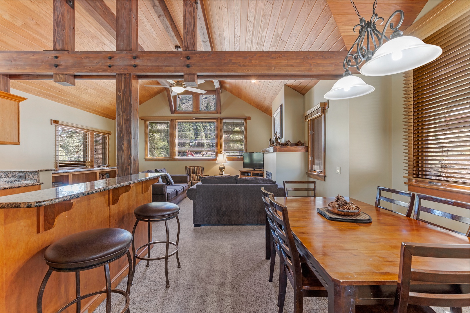 Continuing up the stairs, you'll arrive at the great room, dining room, and kitchen. This open floor plan is ideal for entertaining family or friends, with plenty of seating, including chairs, a couch, and a love seat surrounding the gas fireplace. The great room is equipped with a 40” flat-screen TV and wireless internet access.