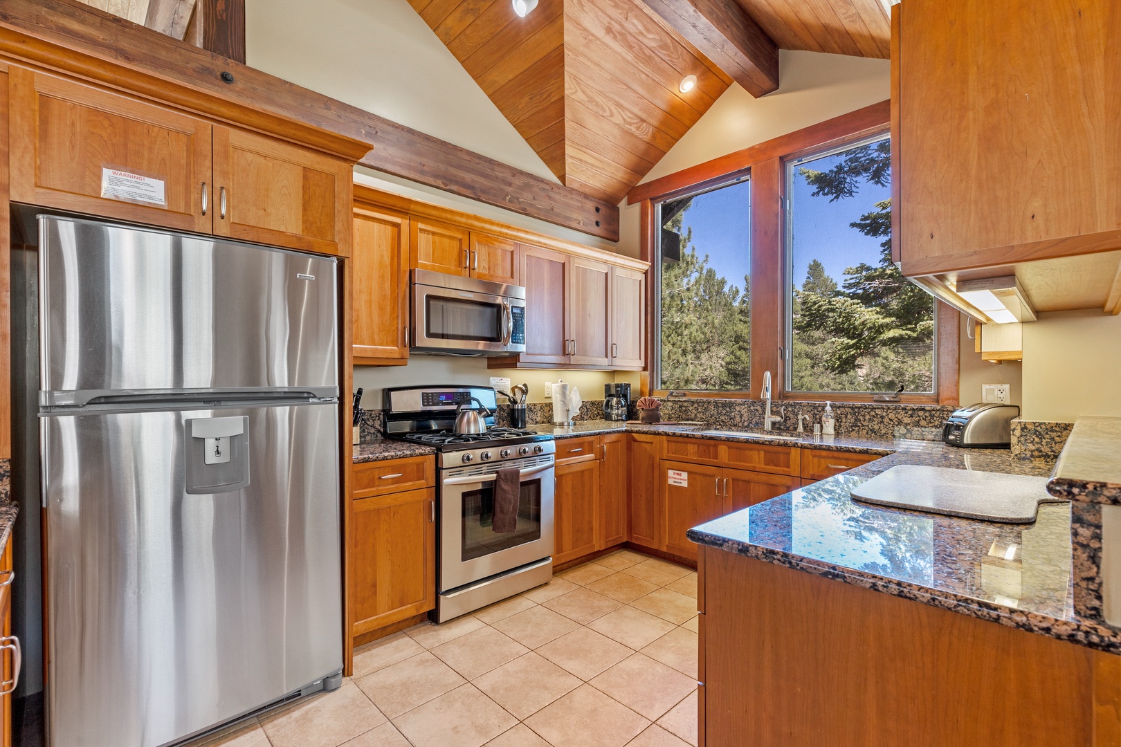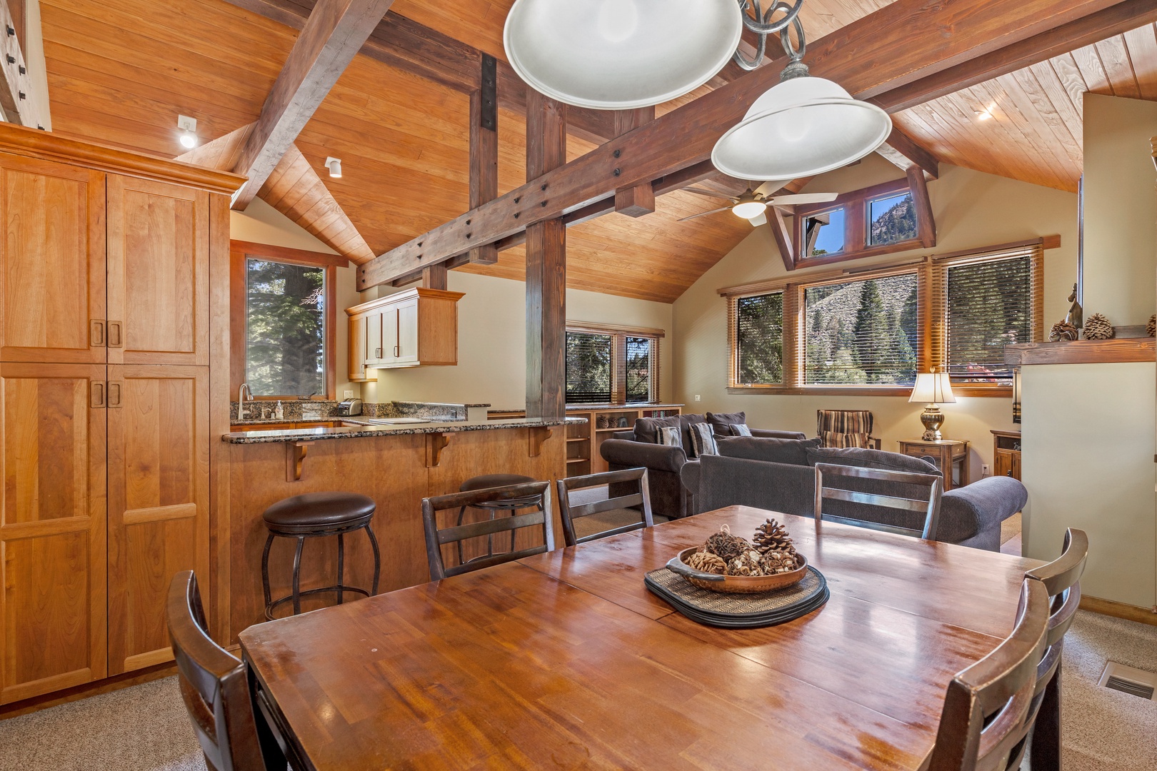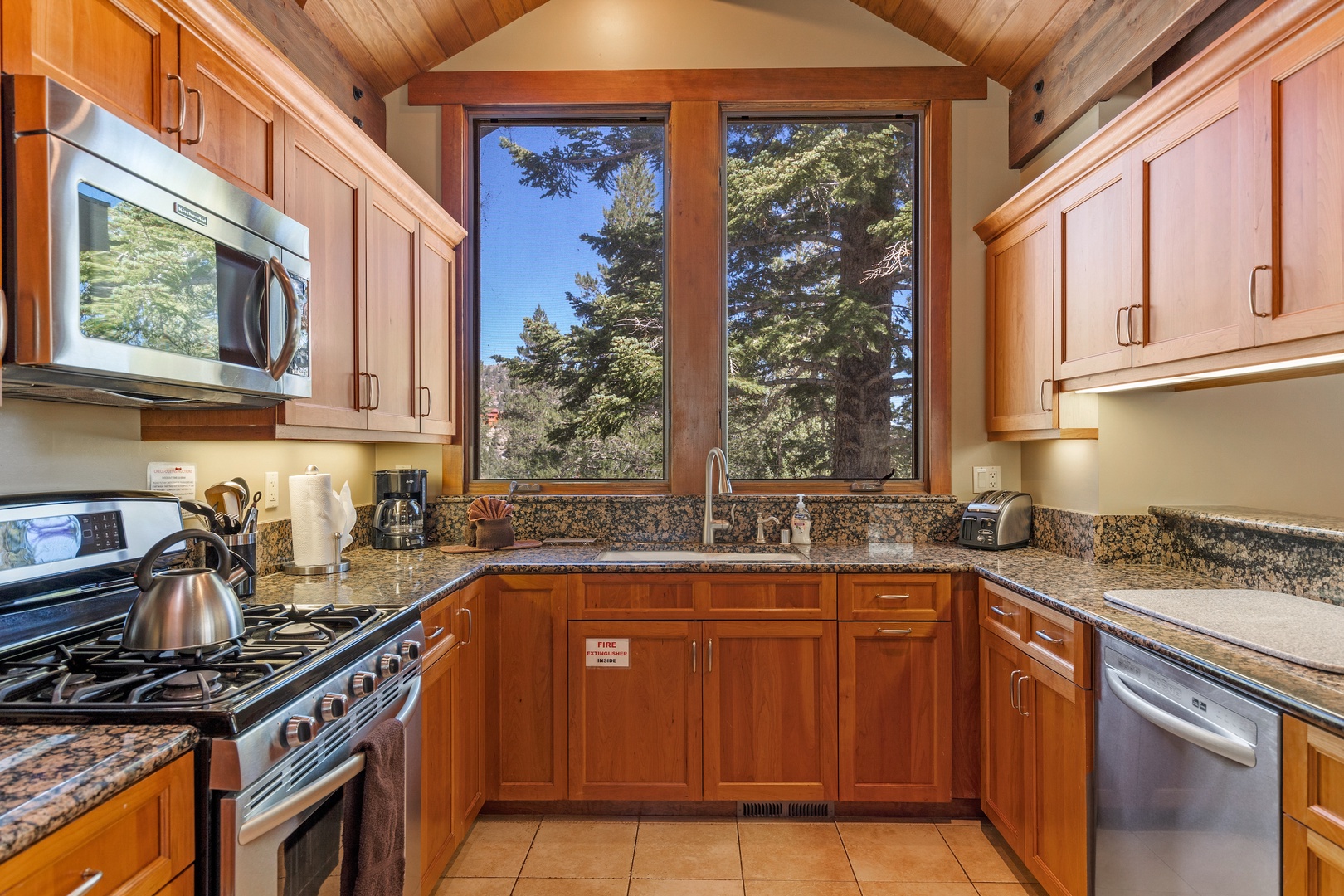 Continuing up the stairs, you'll arrive at the great room, dining room, and kitchen. This open floor plan is ideal for entertaining family or friends, with plenty of seating, including chairs, a couch, and a love seat surrounding the gas fireplace. The great room is equipped with a 40” flat-screen TV and wireless internet access.
