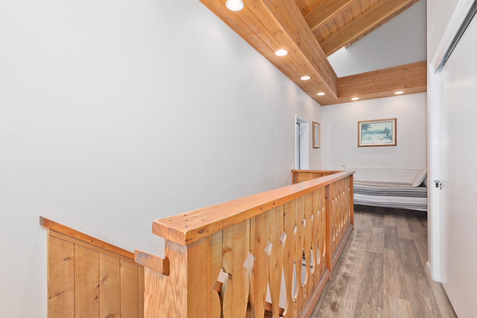 A beloved choice among Interlaken condominiums, this residence serves as an ideal hub for exploring all that June Lake has to offer. Just half a mile from June Mountain, it presents breathtaking views of Gull Lake. Accessible via the second floor, the unit features an open, contemporary kitchen, a living area, a laundry space, and a bedroom with two queen beds and a fully attached bathroom. Ascend to the upper level to find the primary room with a king, bathed in natural light, and offers scenic views of Gull Lake from the private balcony. On the third level, discover an additional bedroom complete with a fully attached bathroom and two more queen beds. In the upstairs den area, there is also a single bed. This home provides the perfect setting to create lasting mountain memories.
