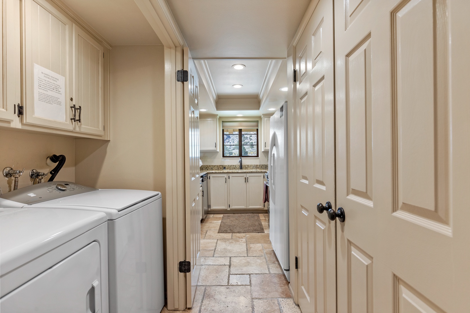 The kitchen is fully equipped and up to date, complete with a washer and dryer to enhance your convenience. The dining room table comfortably seats six, and there are three additional seats at the counter.