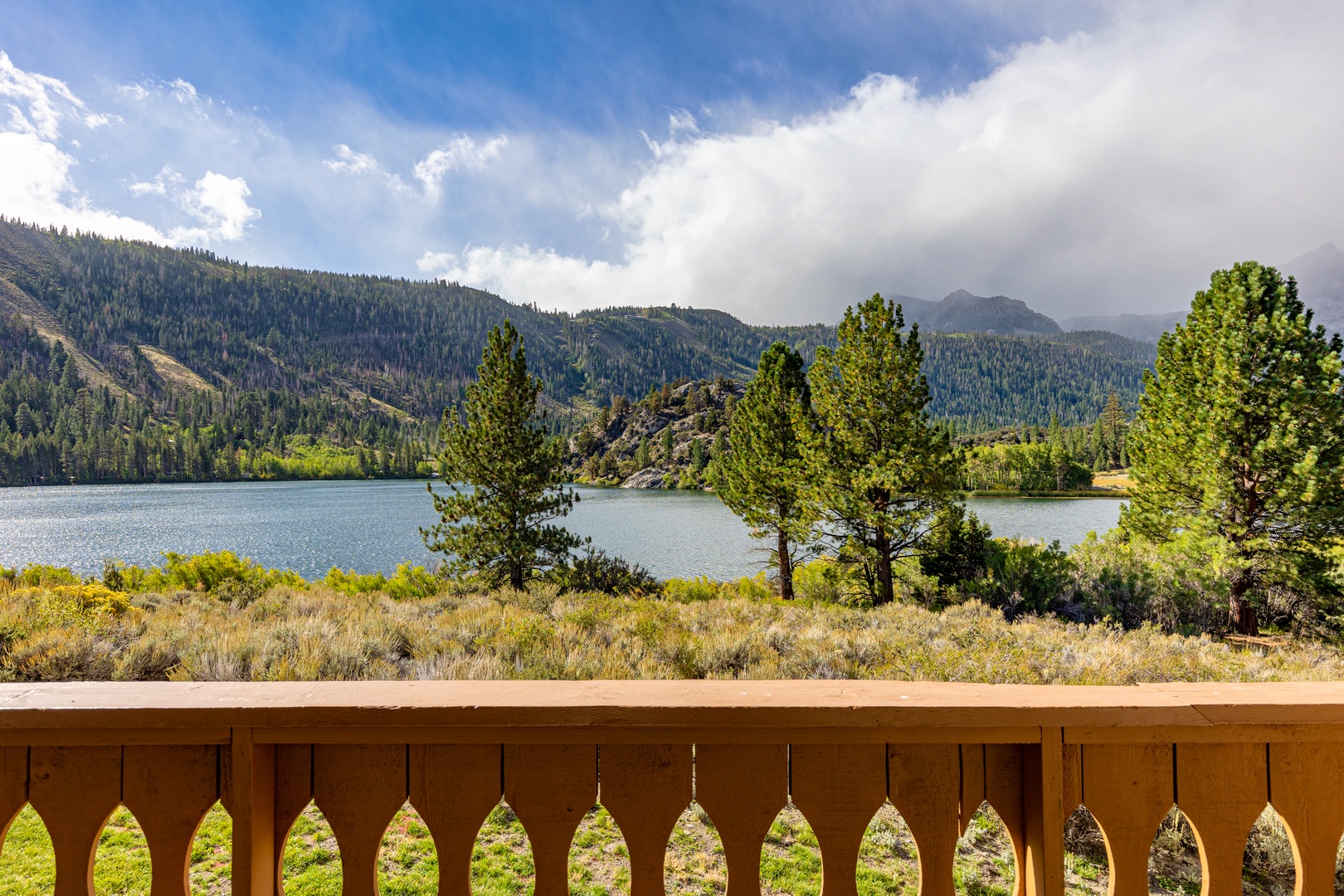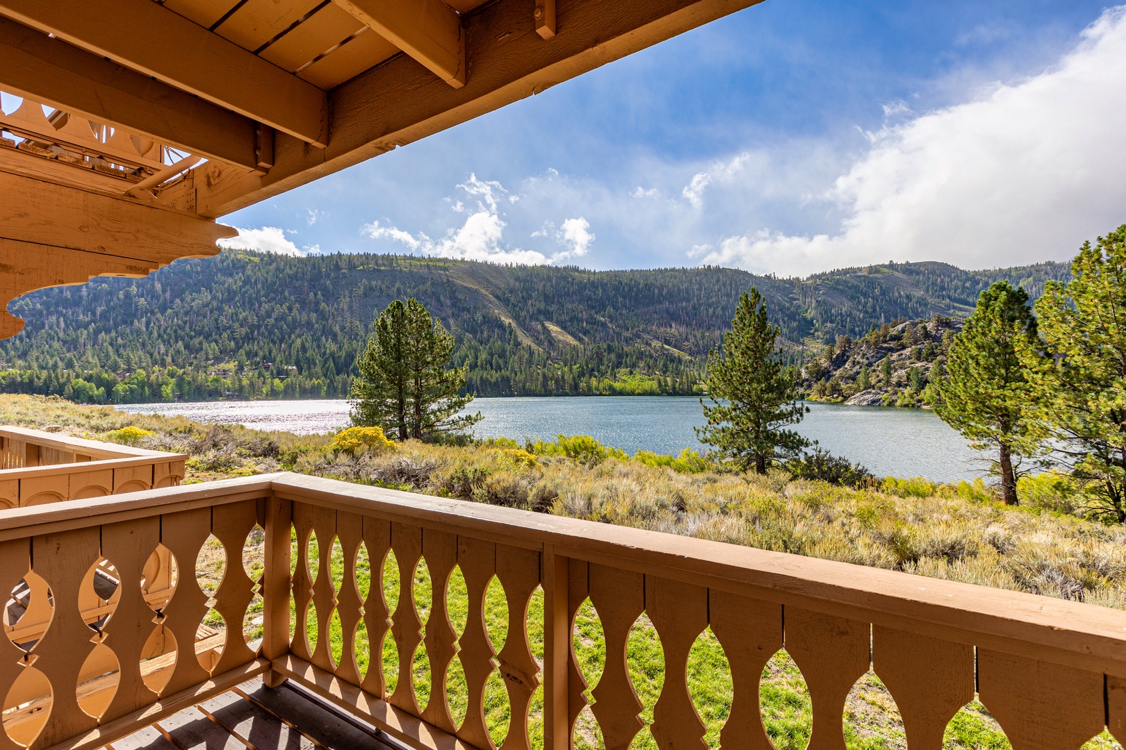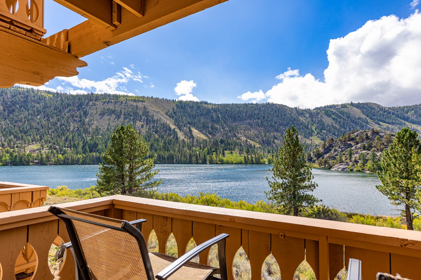 Open the sliding glass doors from the living room, and you'll step out onto the deck. There, you'll discover relaxing deck chairs that invite you to soak in the magnificent views of Gull Lake and the majestic Sierra mountains. It's the perfect spot to unwind and enjoy the natural beauty that surrounds you.