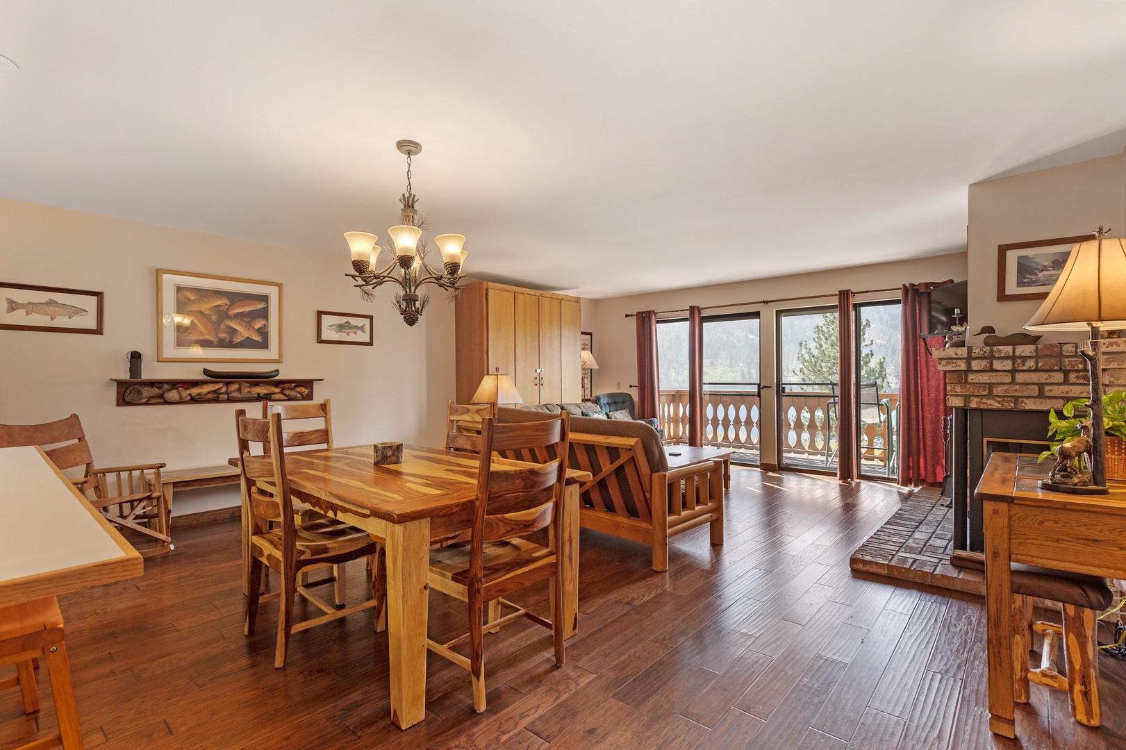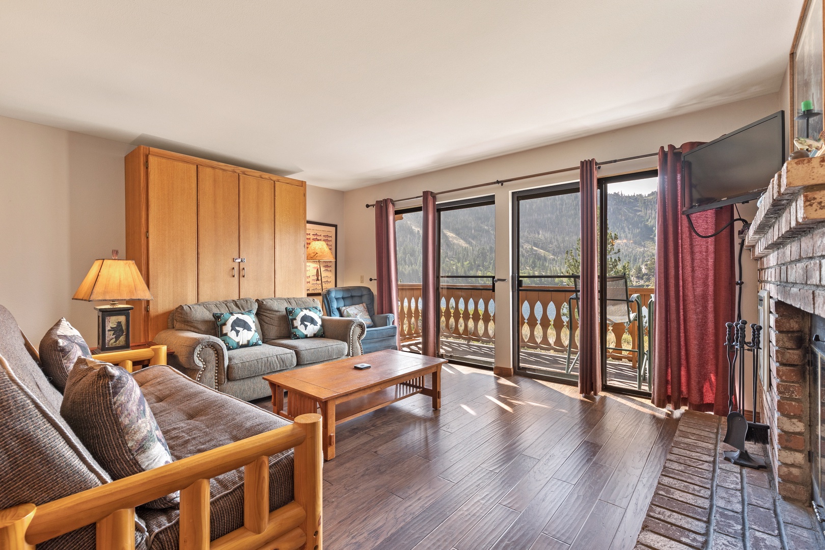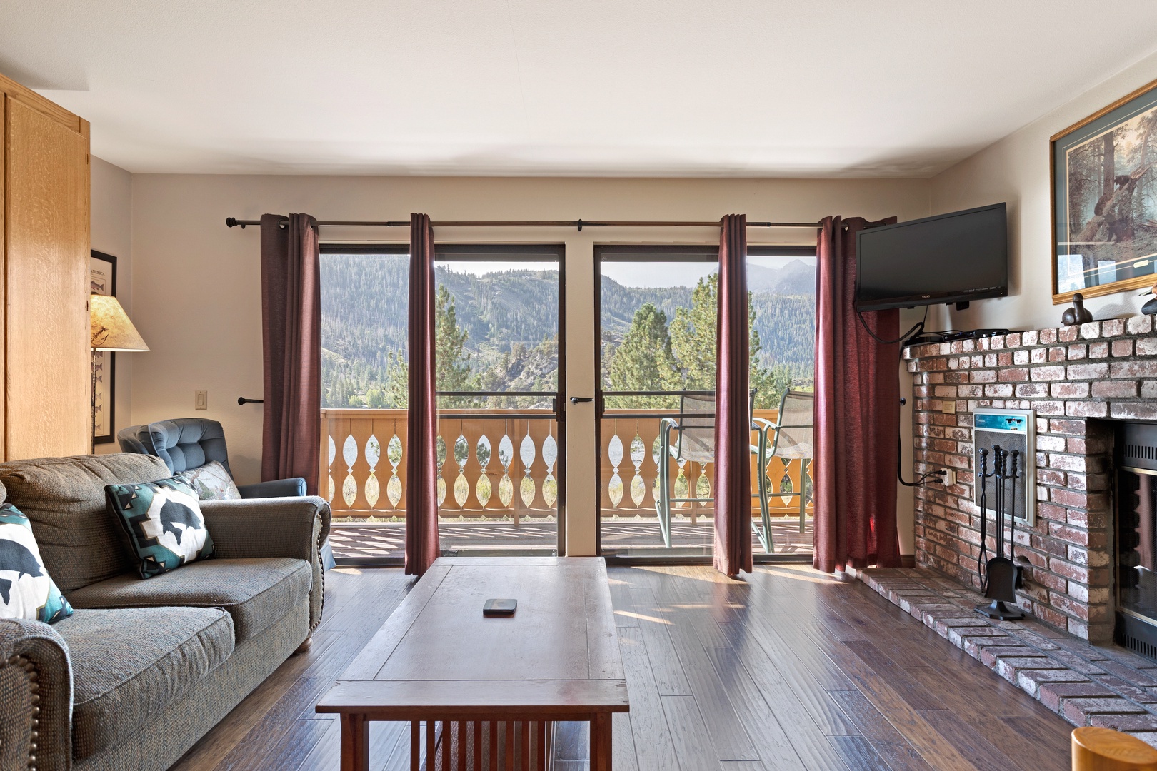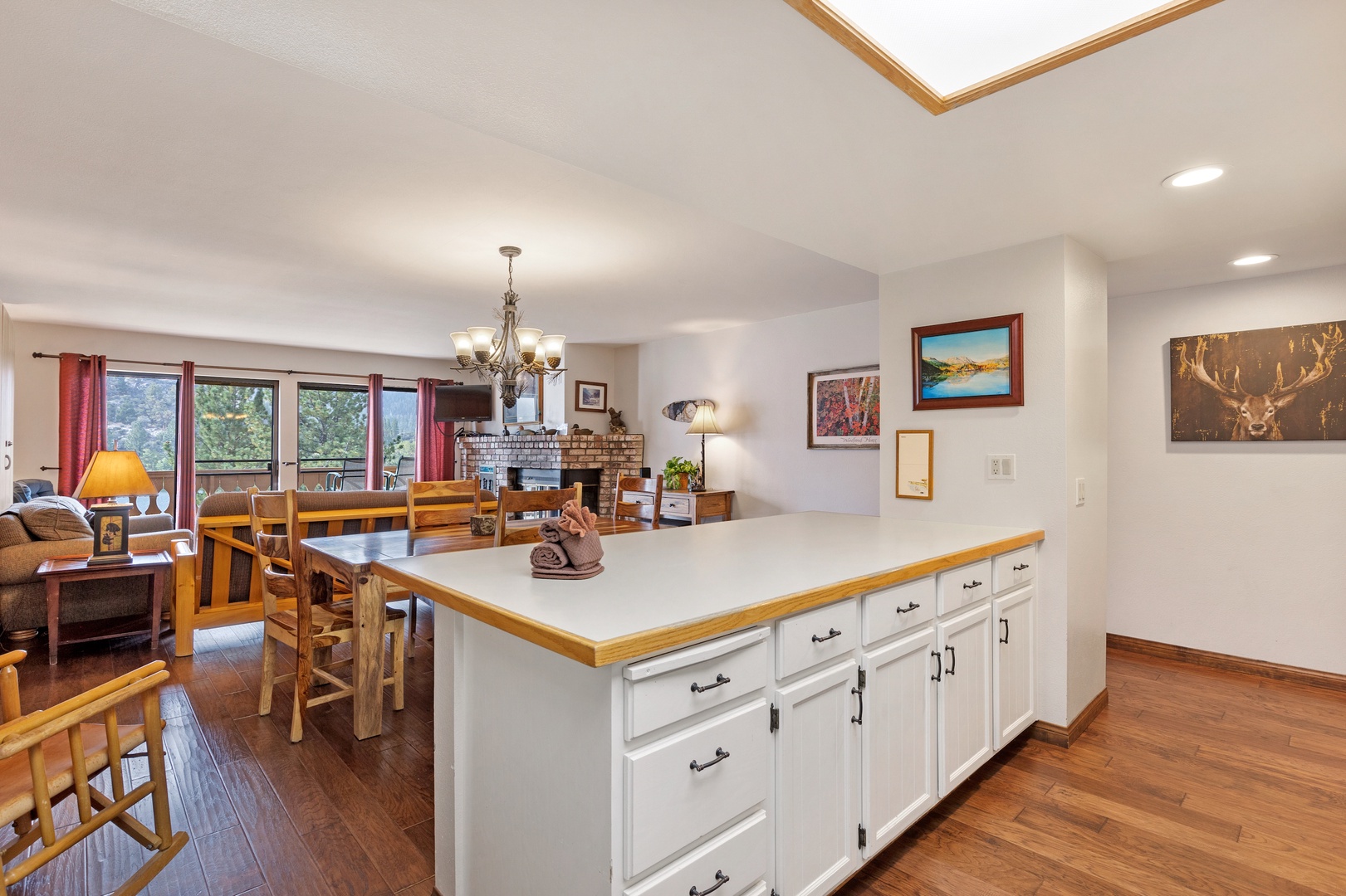 Open the sliding glass doors from the living room, and you'll step out onto the deck. There, you'll discover relaxing deck chairs that invite you to soak in the magnificent views of Gull Lake and the majestic Sierra mountains. It's the perfect spot to unwind and enjoy the natural beauty that surrounds you.