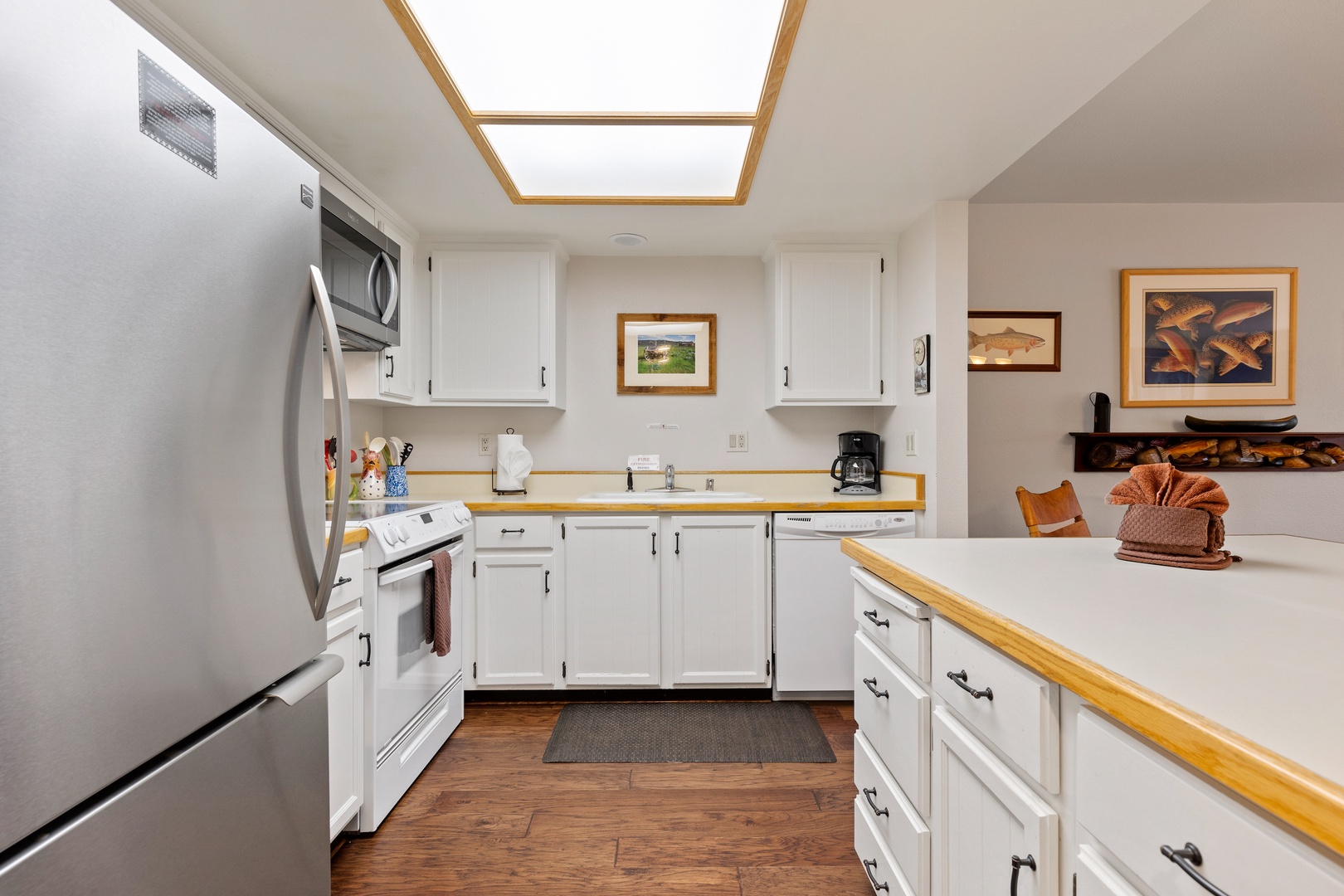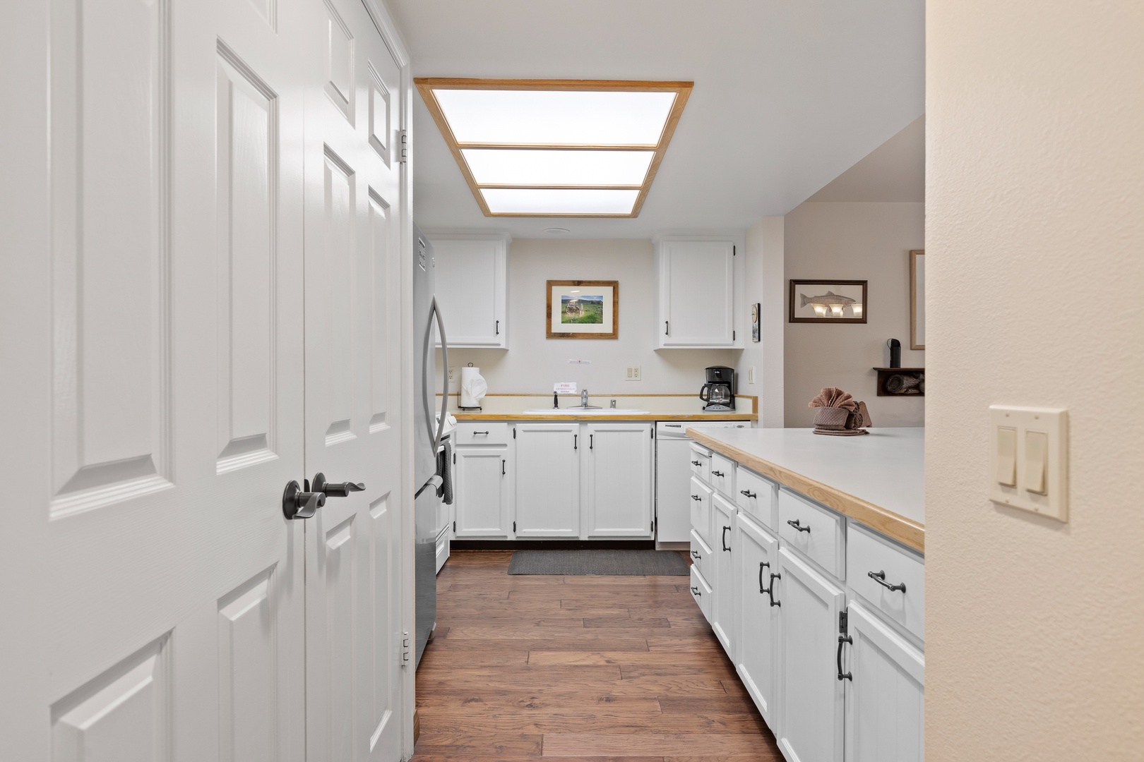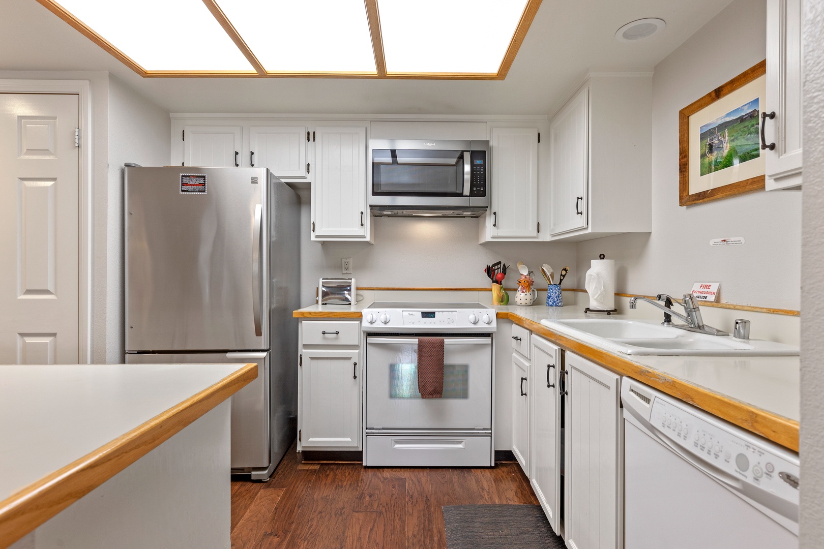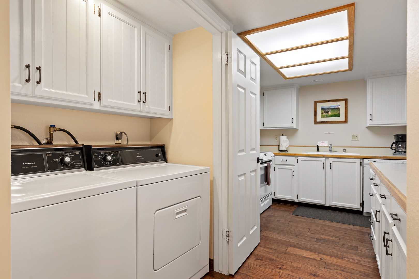 Continuing down the hallway, you'll come upon a fully stocked kitchen equipped with all the essentials you need for your stay. The kitchen is bathed in natural light, and you'll also find a washer and dryer tucked away for your use.