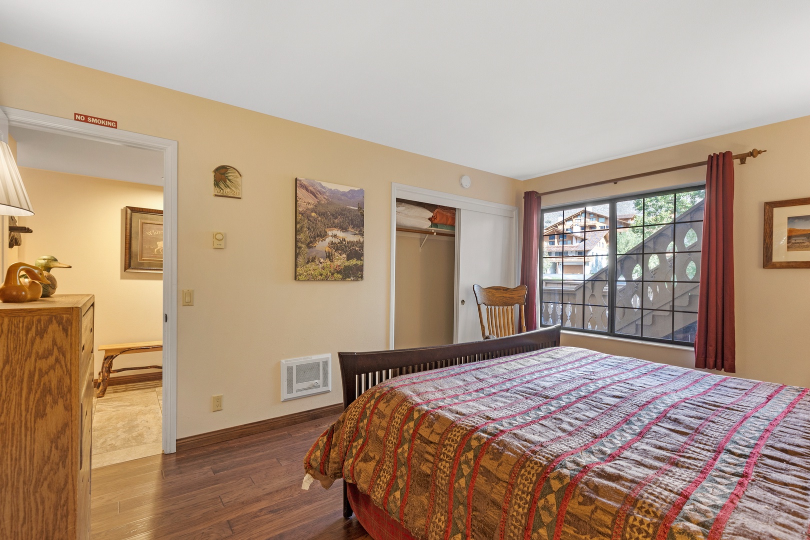 As you step into this spacious condo, you'll discover a welcoming layout. To your left, you'll find the master bedroom, which features a beautifully adorned king-size wooden bed, a cozy rocking chair perfect for reading, a large window that bathes the room in natural light, and a full attached bathroom for your convenience.