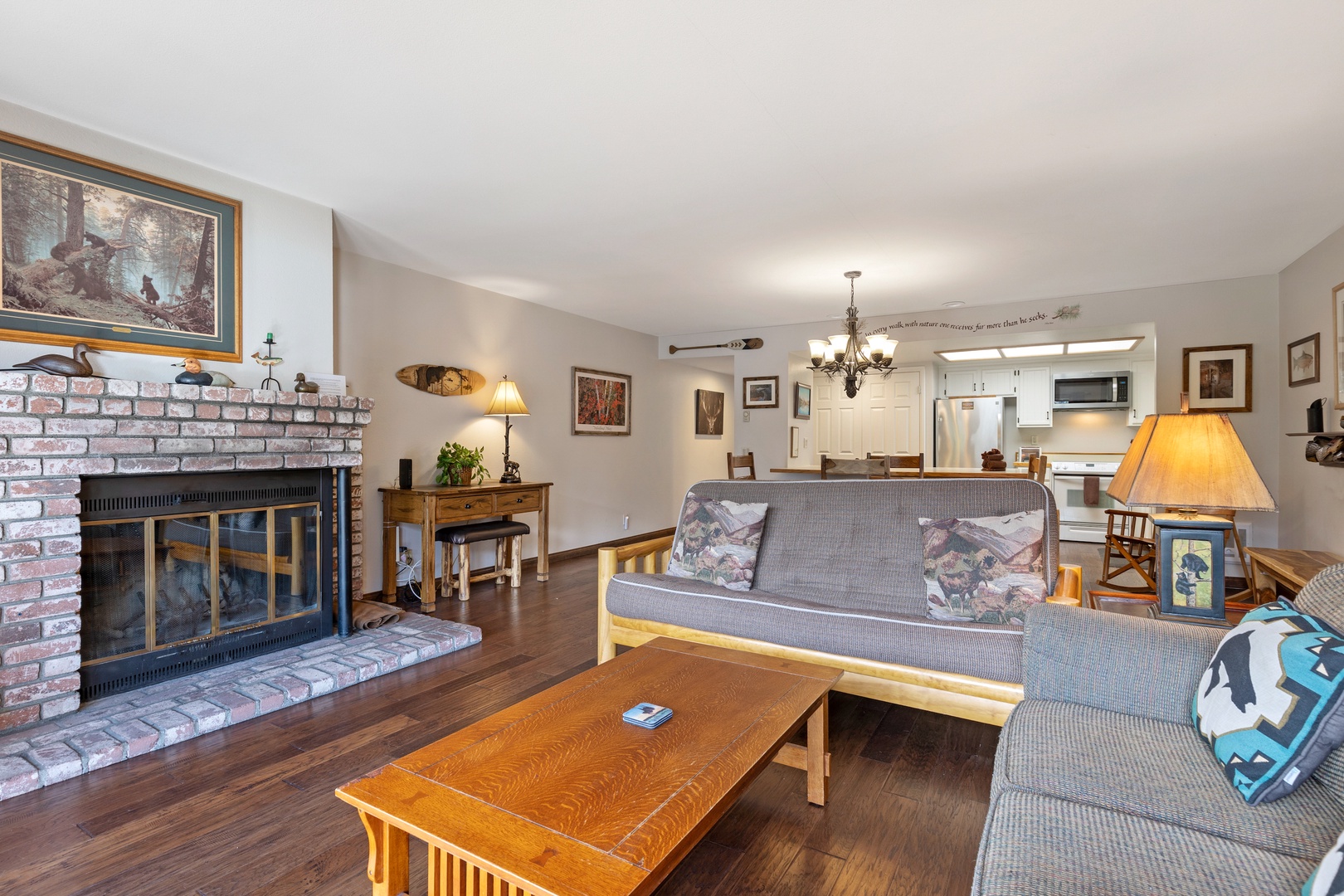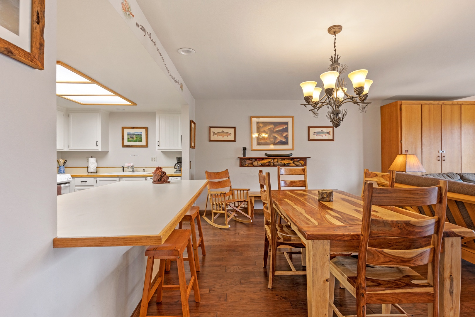 The living room exudes comfort with its rocking chair, loveseat, armchair, and futon for ample seating. Entertainment is at your fingertips with a 32" flat-screen TV paired with a DVD player.