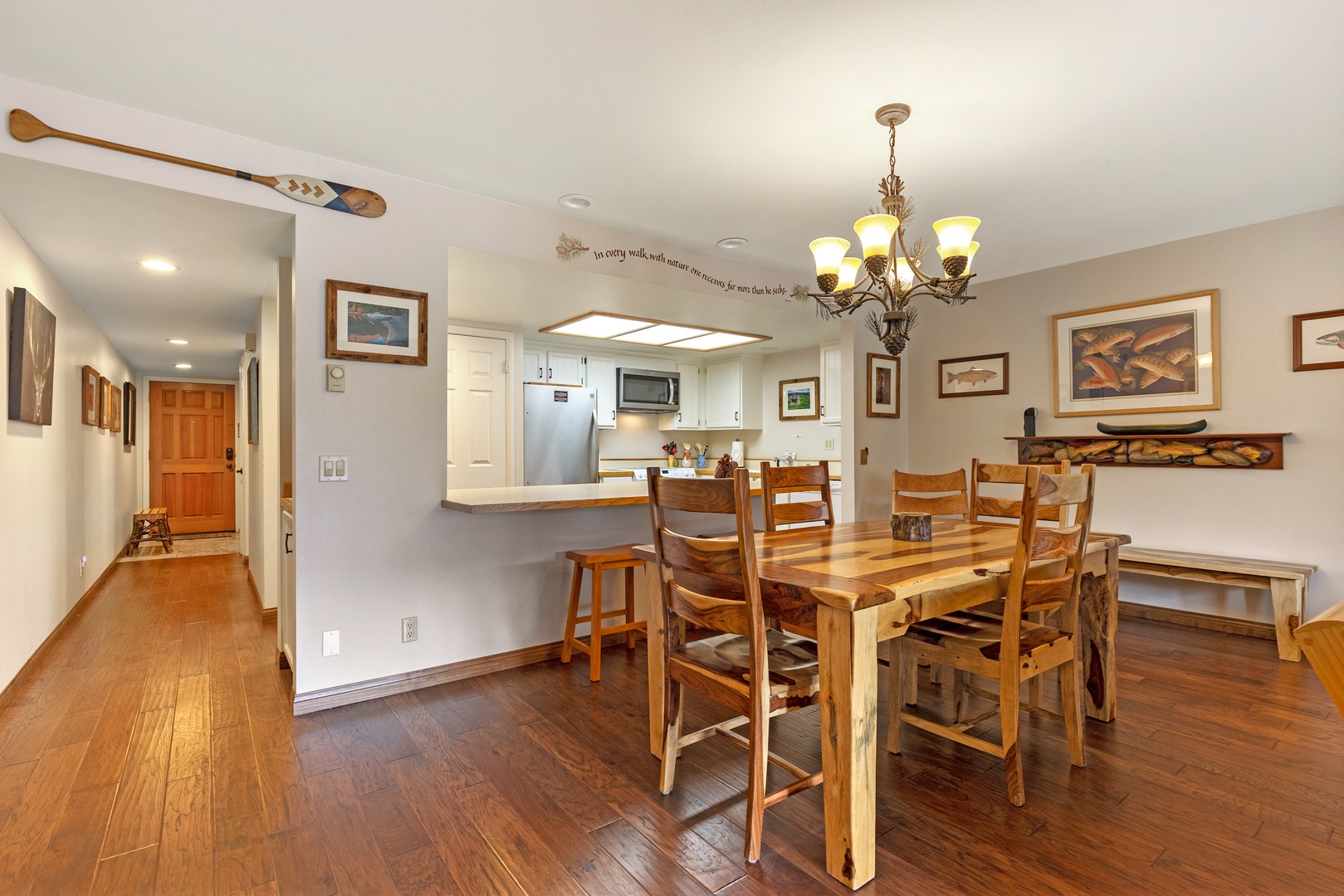 A tastefully colored wooden dining table comfortably seats four, and there are two additional seats at the counter.