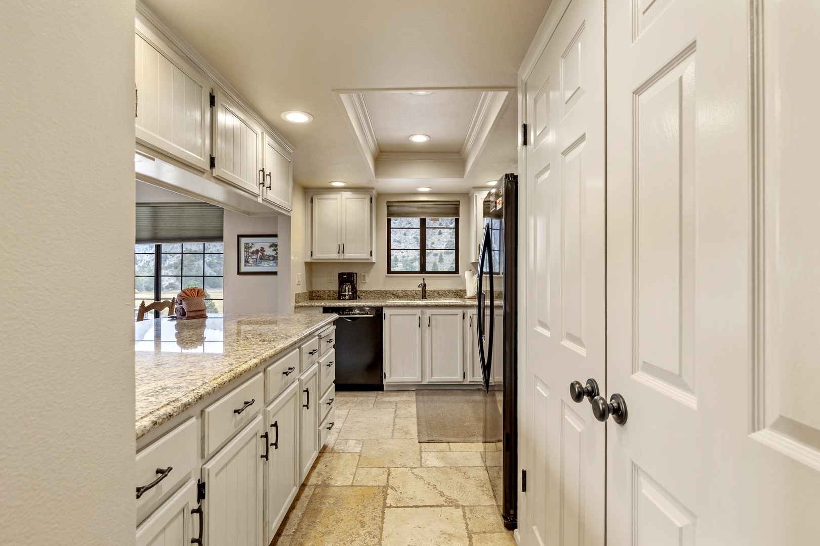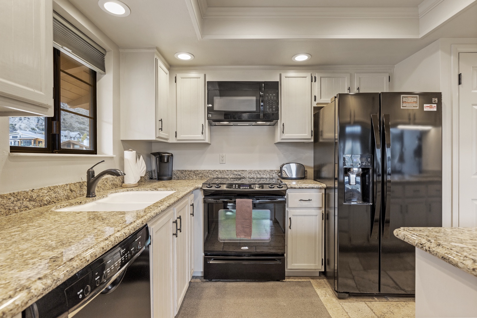 Continuing down the hall, you'll enter the remodeled kitchen, complete with new appliances and elegant granite countertops. The kitchen is fully equipped to meet your culinary needs, and there's additional seating for three at the counter. The adjacent dining room table comfortably accommodates five.