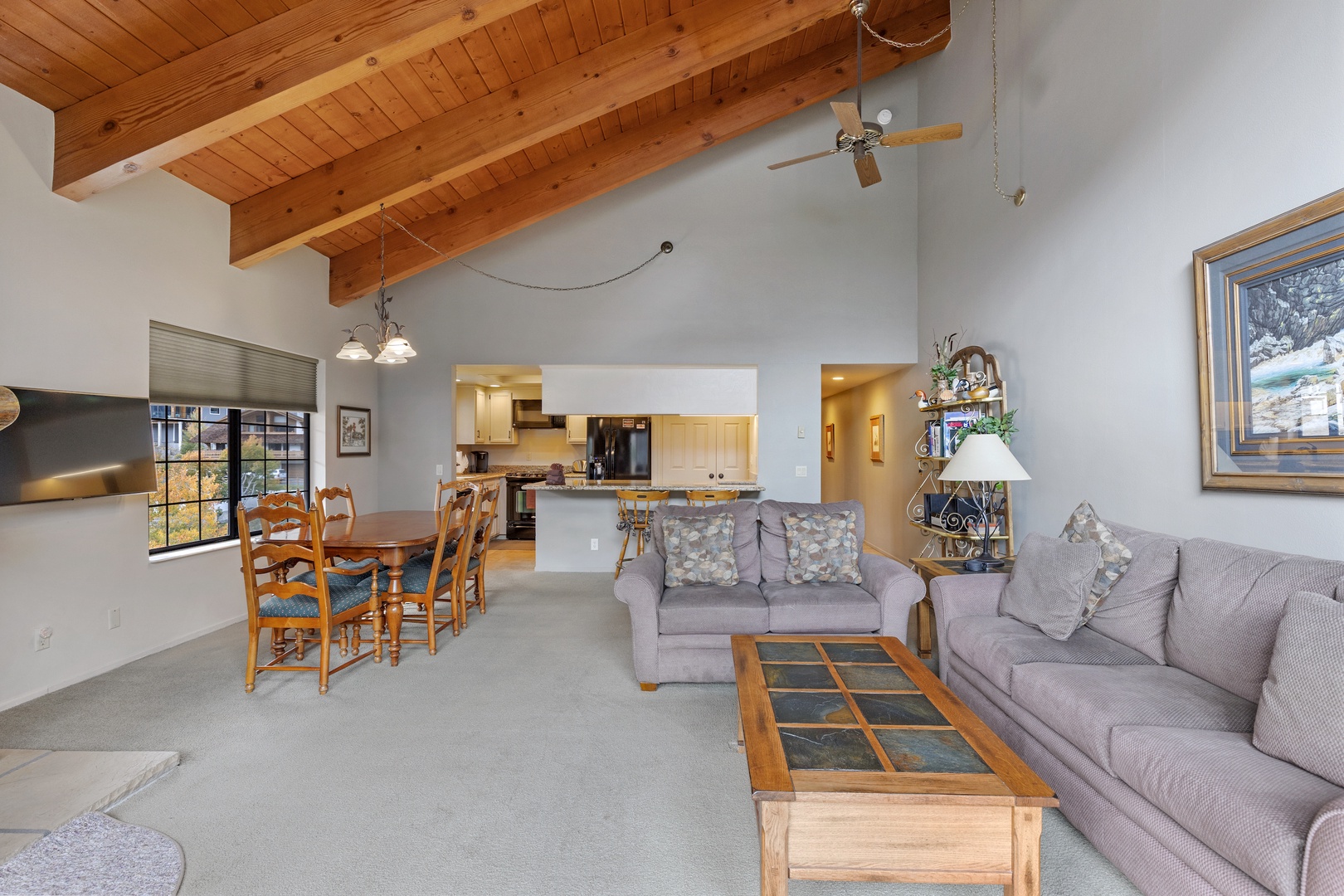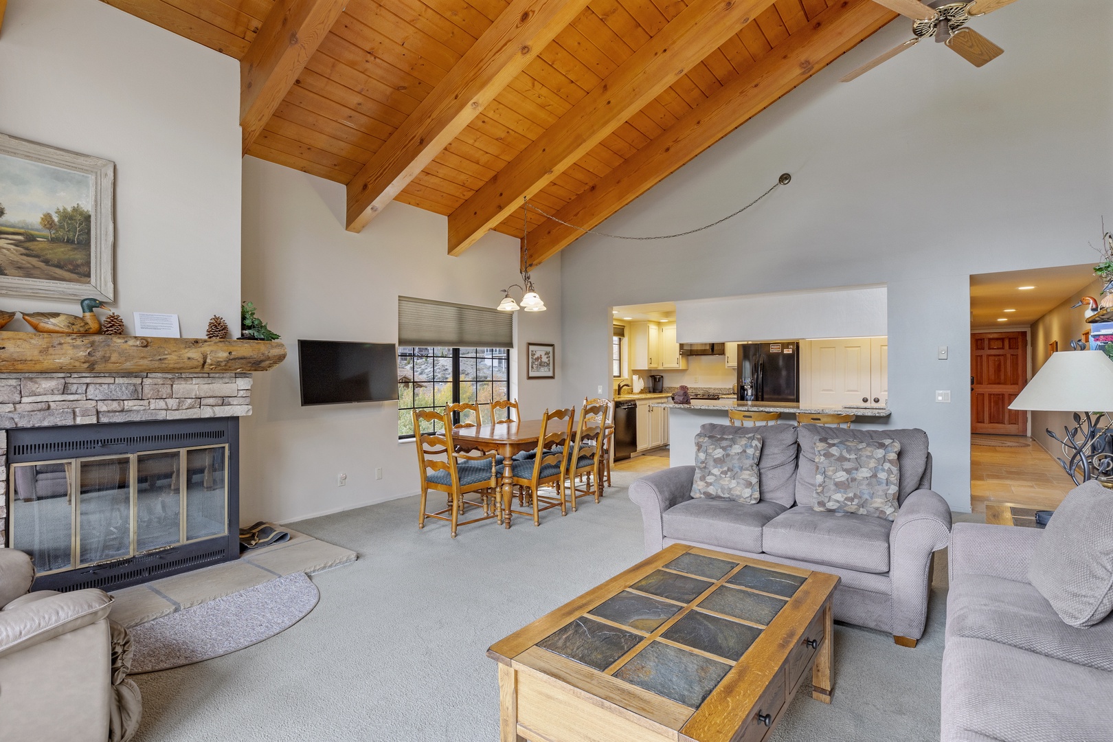 The spacious great room is designed for relaxation, with comfortable seating, a welcoming fireplace, a TV for entertainment, and free wireless internet access.