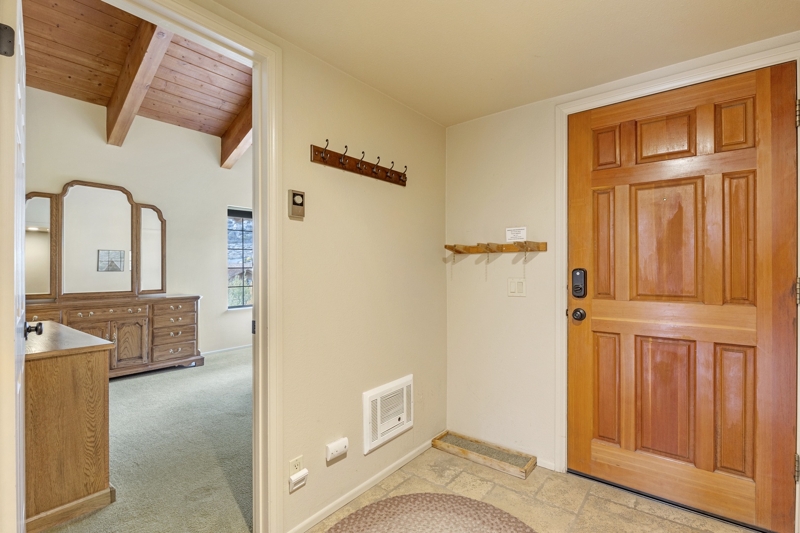 As you step into this inviting lakefront condo, you'll first notice the convenient ski racks and extra storage space, perfect for your outdoor gear. To the right, you'll find the bedroom, featuring a comfortable queen-sized bed. The bedroom is accompanied by a fully upgraded attached bathroom that also connects to the hallway, ensuring convenience and privacy.