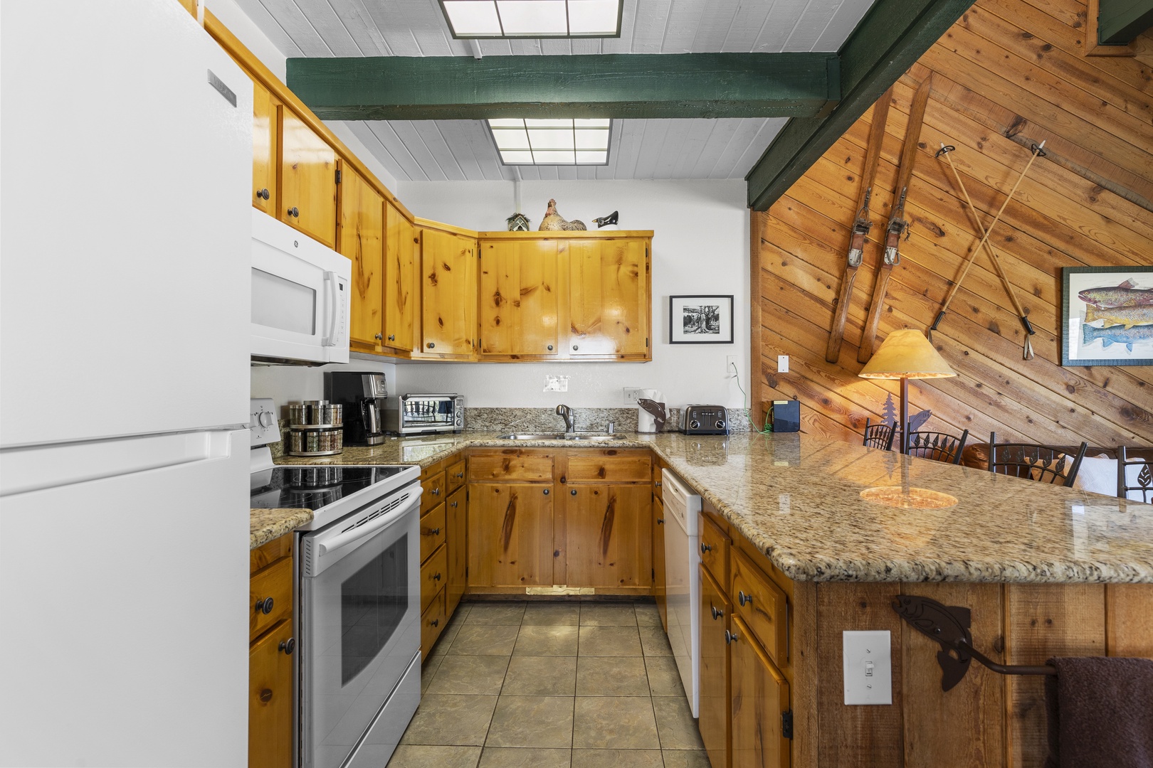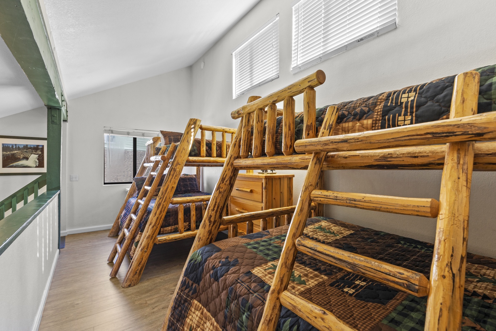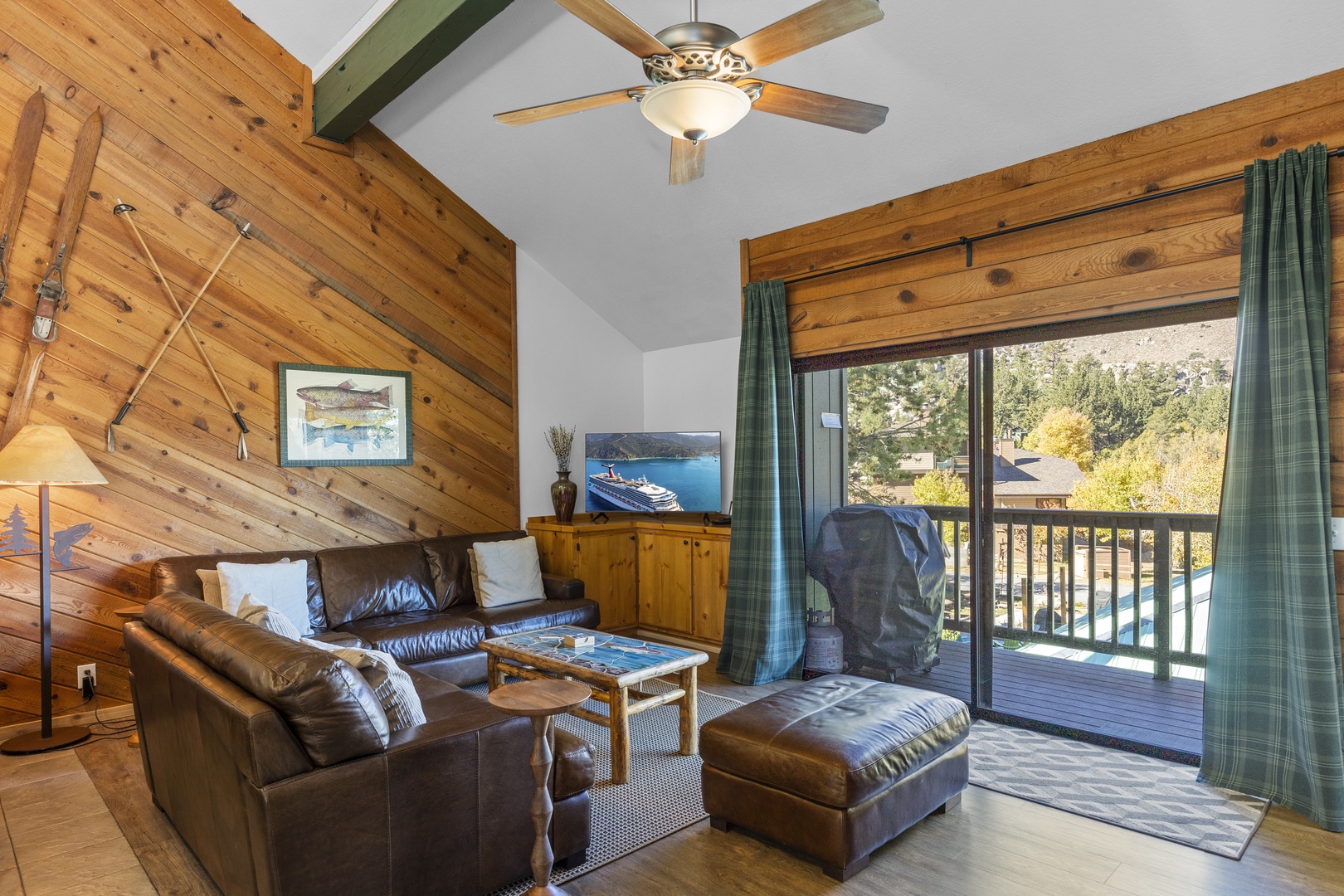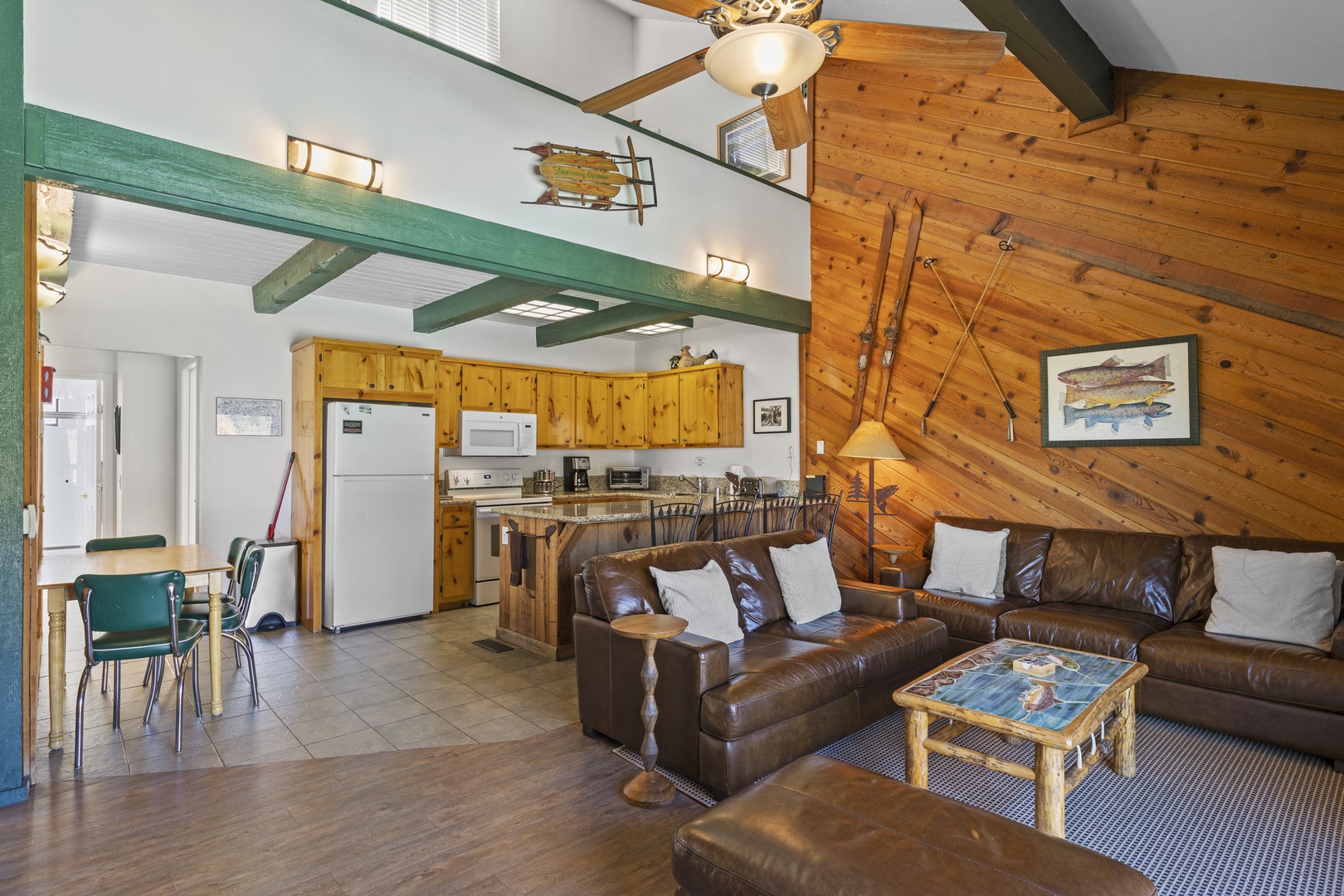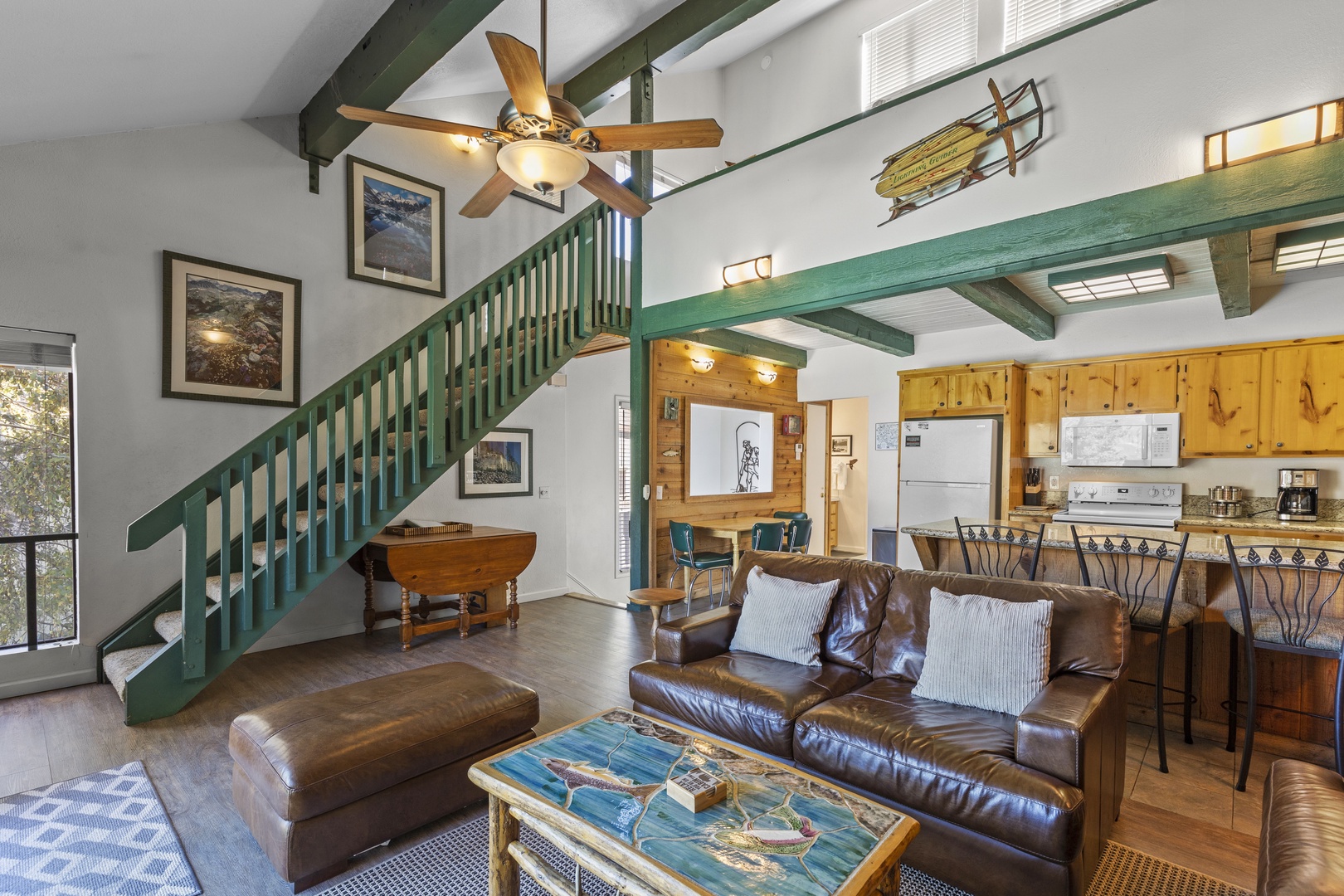 Upon entering this townhome, you'll find a primary room on the first floor, along with a convenient mudroom and a washer-dryer for added practicality. Head upstairs to the living area, where you'll encounter two comfortable leather sofas and a TV. The open-concept kitchen is fully equipped and features bar seating, as well as a small table for four. From the living area, step out onto the balcony, which offers splendid views of June Lake. Another bedroom on this level features a queen bed. The loft on the third story provides additional sleeping space with two queen/twin bunk beds. This townhome is well-appointed and offers a comfortable space for your stay in the beautiful June Lake area.