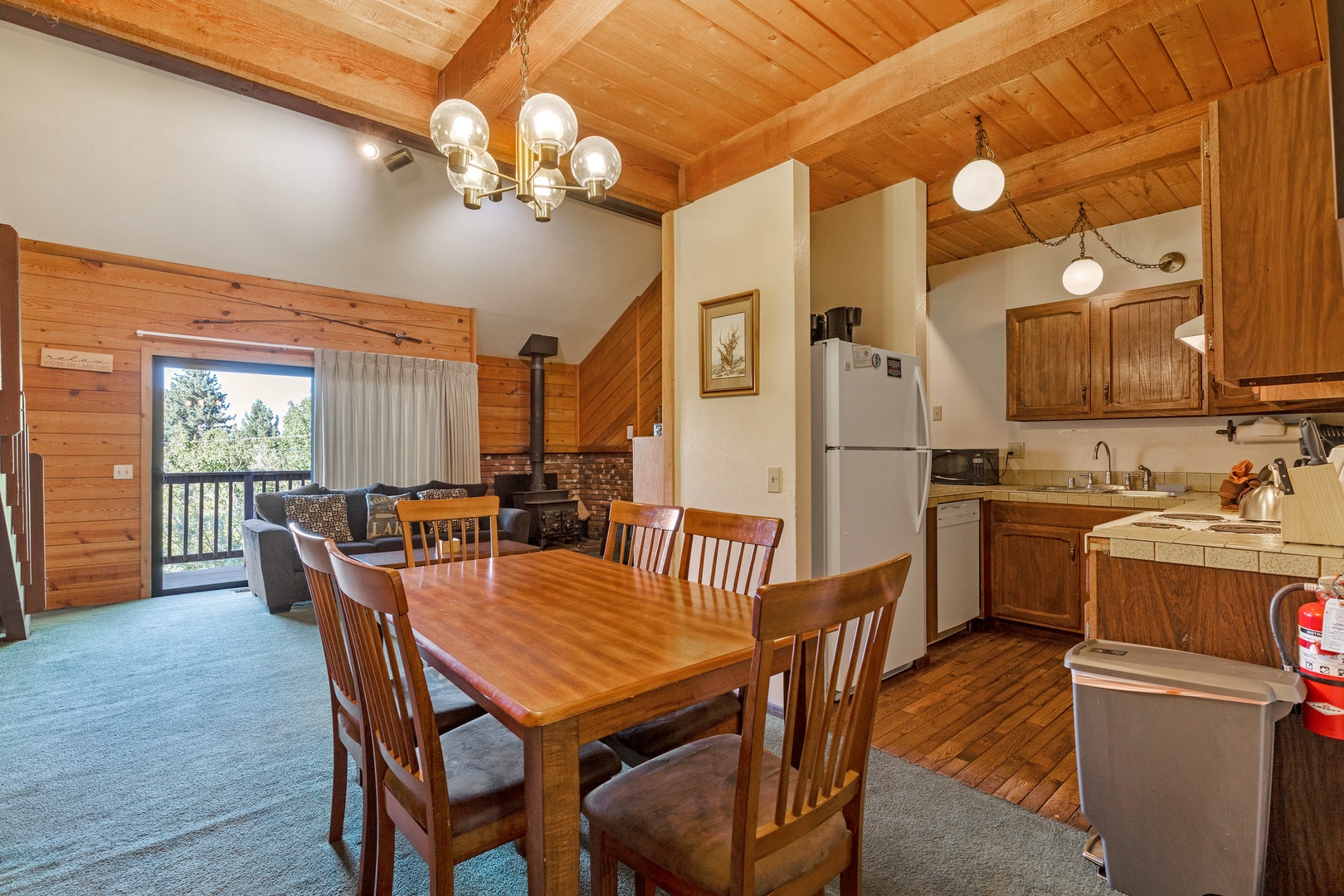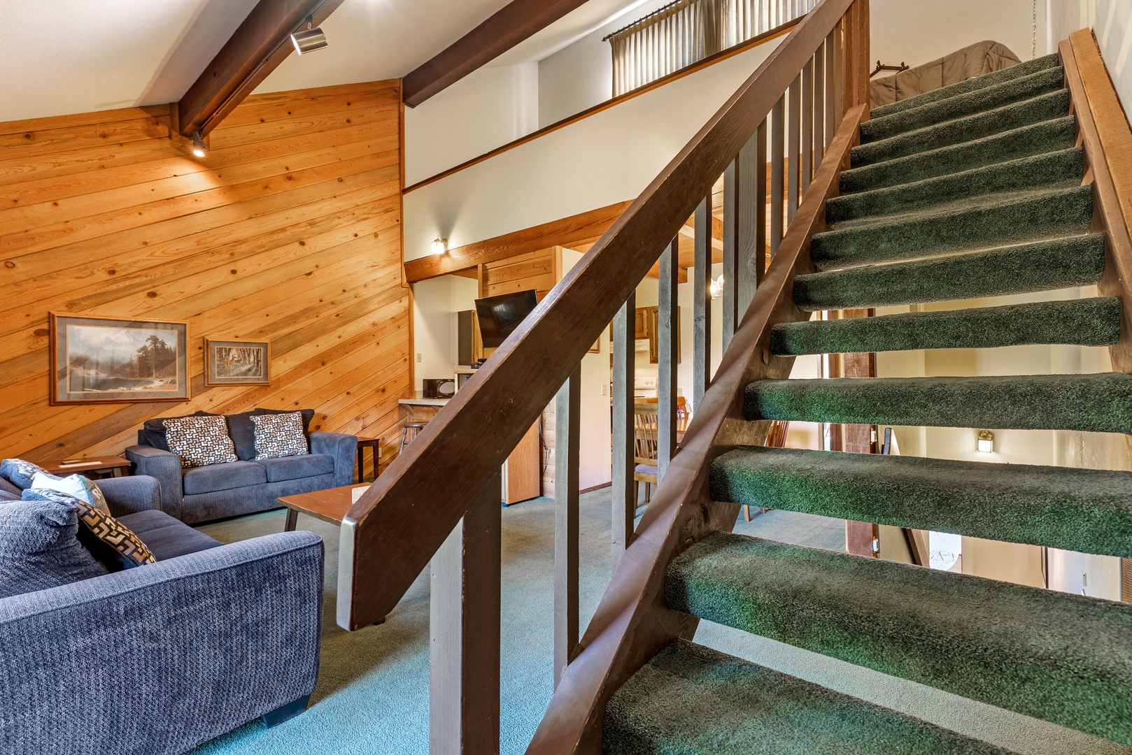 Moving upstairs to the main living area, you'll discover plenty of seating, a cozy wood-burning fireplace, and a TV for relaxation and entertainment. Both of the couches have pull-out beds. The kitchen is well-equipped with all the essentials for preparing delicious meals, and there's a dining table that comfortably seats six.