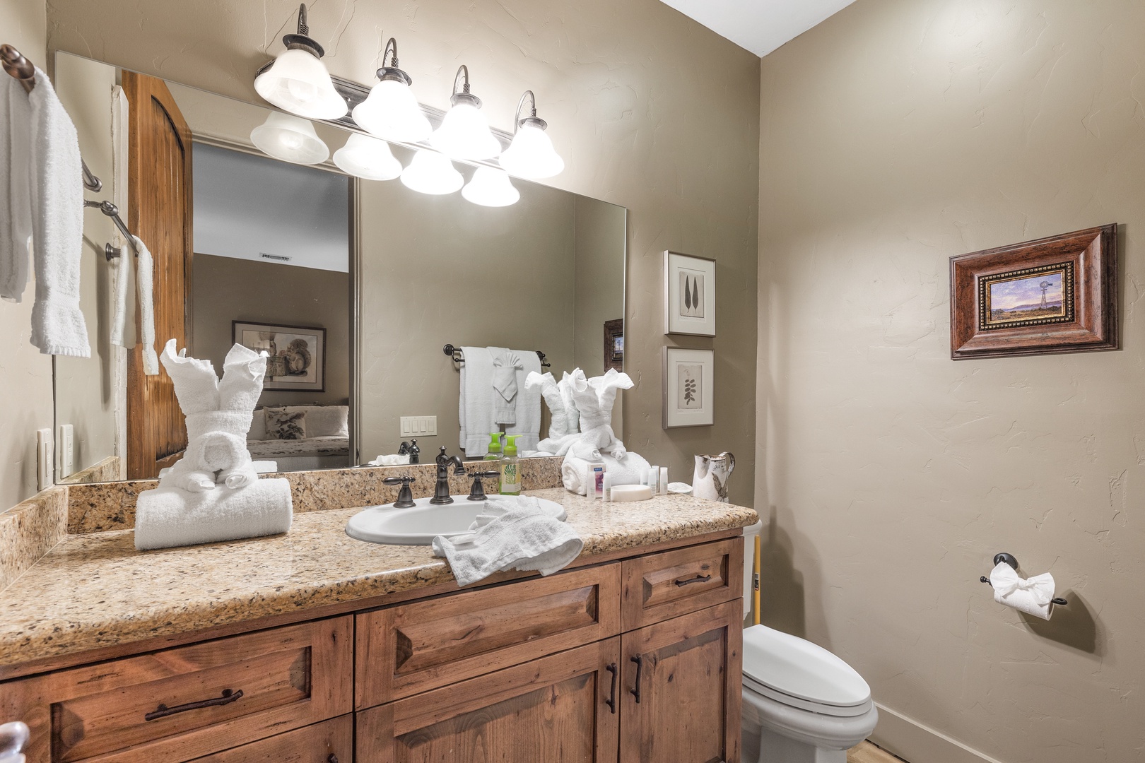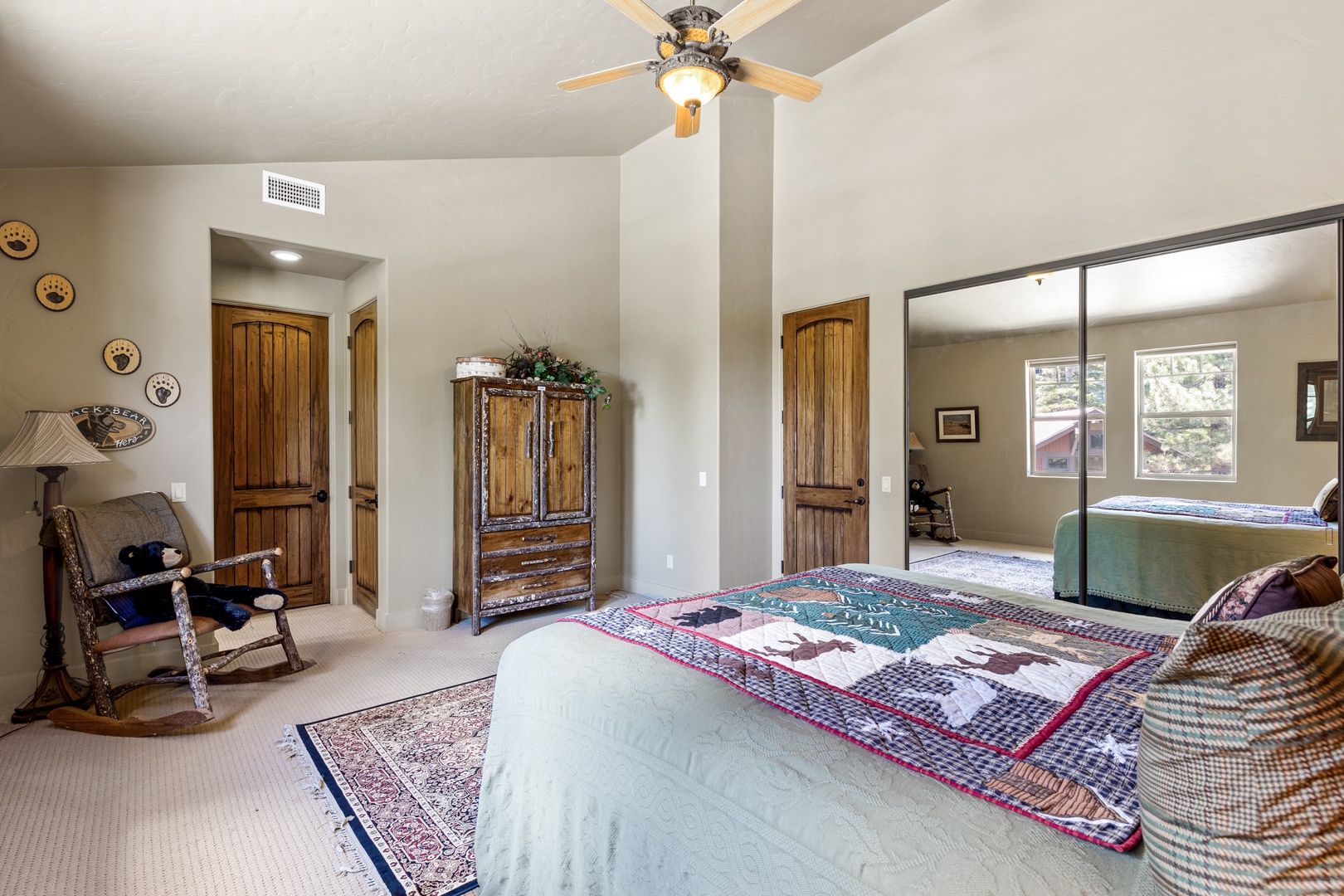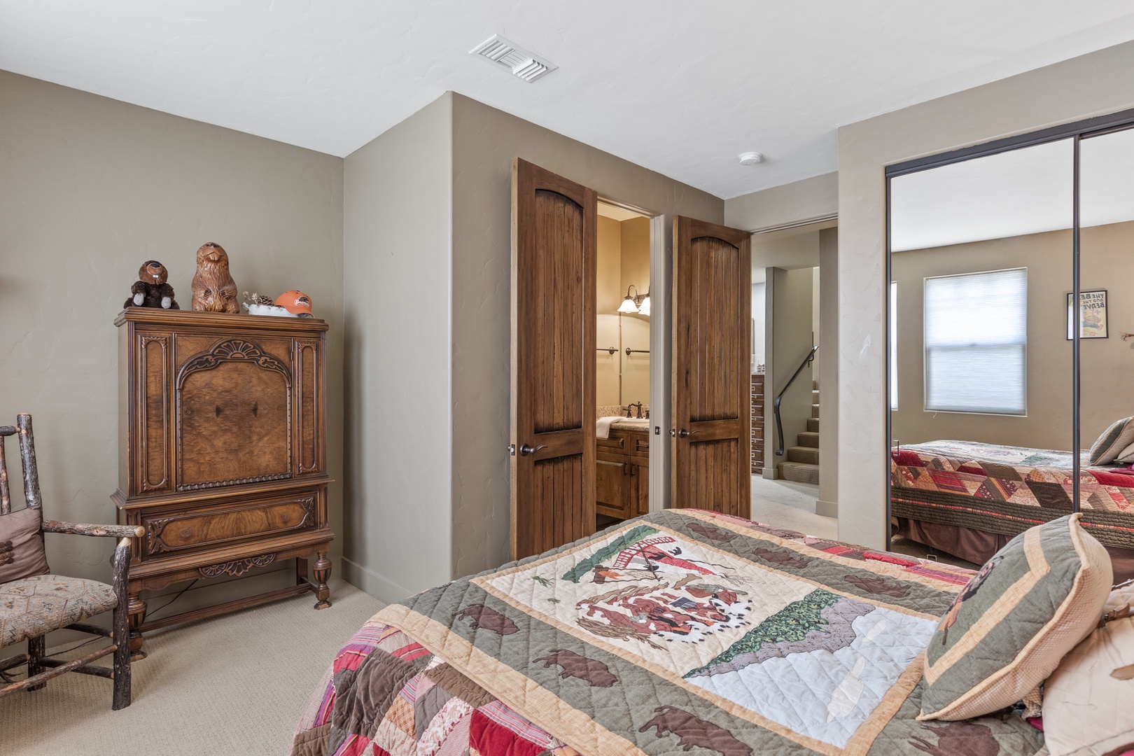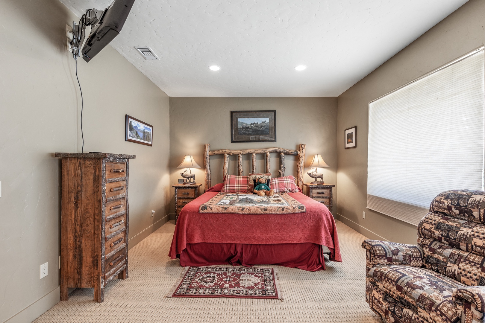As you enter the main floor, you'll be welcomed by a beautifully decorated entryway that immediately makes you feel at home. To the right, you'll find a convenient half bath, a laundry room, and access to the garage. The first bedroom on this floor, known as the Bear Room, boasts a comfortable queen bed and an attached bathroom.