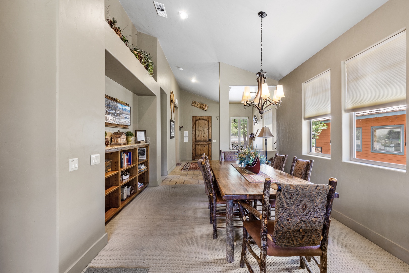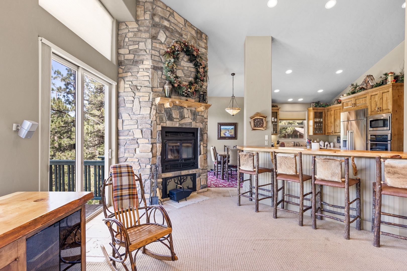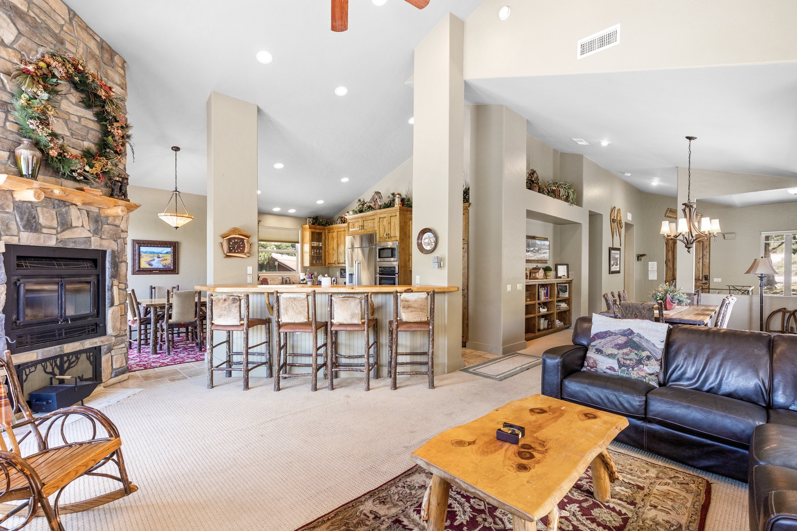 As you enter the main floor, you'll be welcomed by a beautifully decorated entryway that immediately makes you feel at home. To the right, you'll find a convenient half bath, a laundry room, and access to the garage. The first bedroom on this floor, known as the Bear Room, boasts a comfortable queen bed and an attached bathroom.