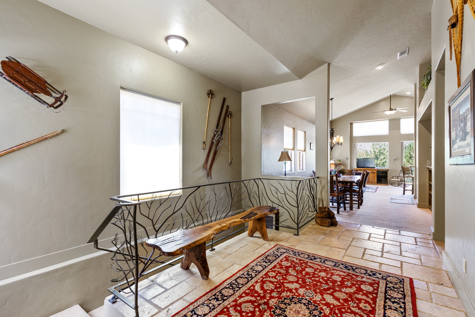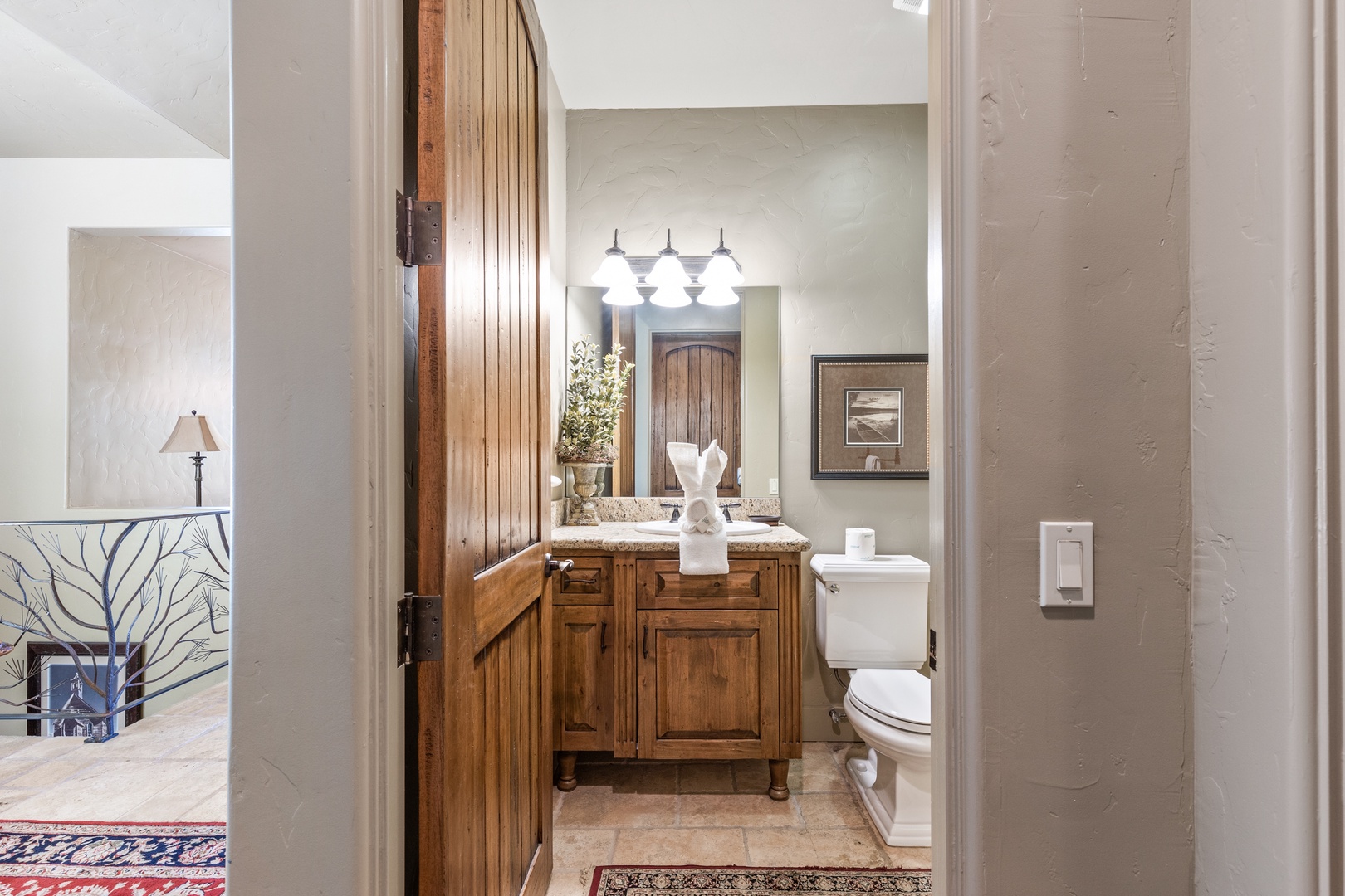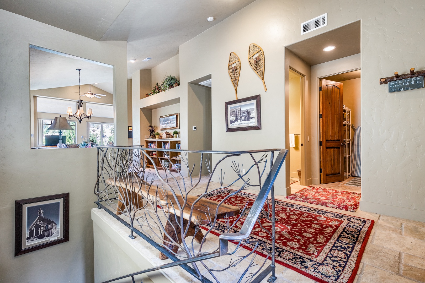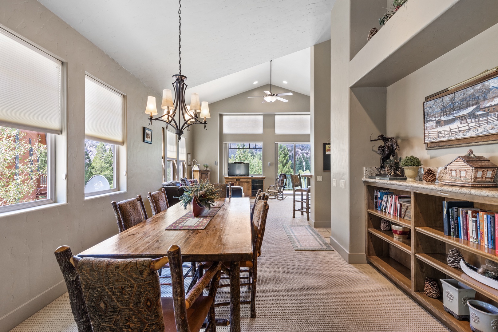 As you enter the main floor, you'll be welcomed by a beautifully decorated entryway that immediately makes you feel at home. To the right, you'll find a convenient half bath, a laundry room, and access to the garage. The first bedroom on this floor, known as the Bear Room, boasts a comfortable queen bed and an attached bathroom.