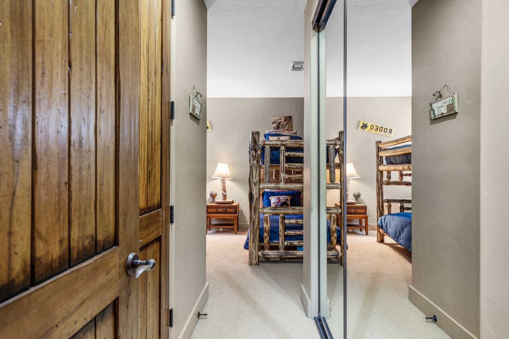 Heading downstairs, you'll discover three more bedrooms along with a den area. The den features a queen Murphy bed, ideal for kids or teenagers. Next to the den is the Camp room, equipped with two sets of log bunk beds. This room is adjoined to a half bath and a shower. On the opposite side of the Camp room, you'll find the Beaver room, offering a queen bed and a full closet.