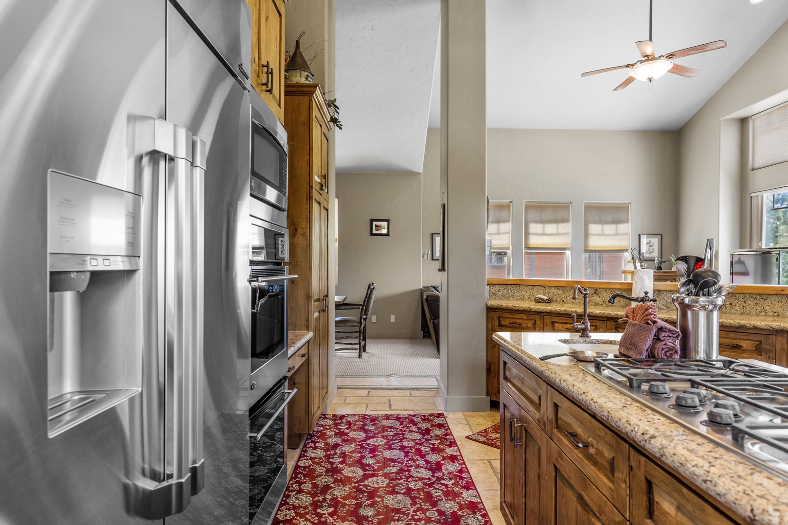 Continuing on, you'll encounter the dining room, living room, and kitchen, all seamlessly flowing together. A wood-burning fireplace adds a cozy ambiance to these spaces, making them perfect for gathering and relaxation. The large gourmet kitchen is fully equipped and has everything you'll need to prepare family meals.