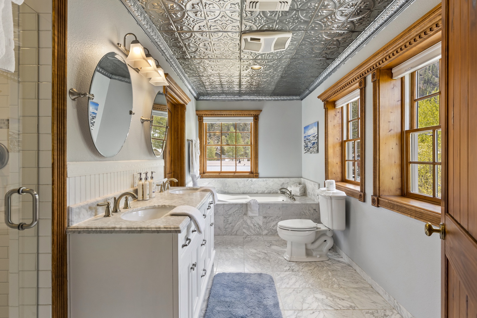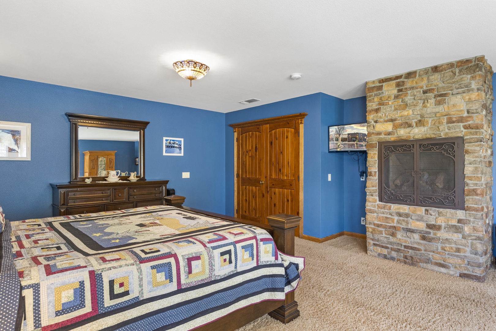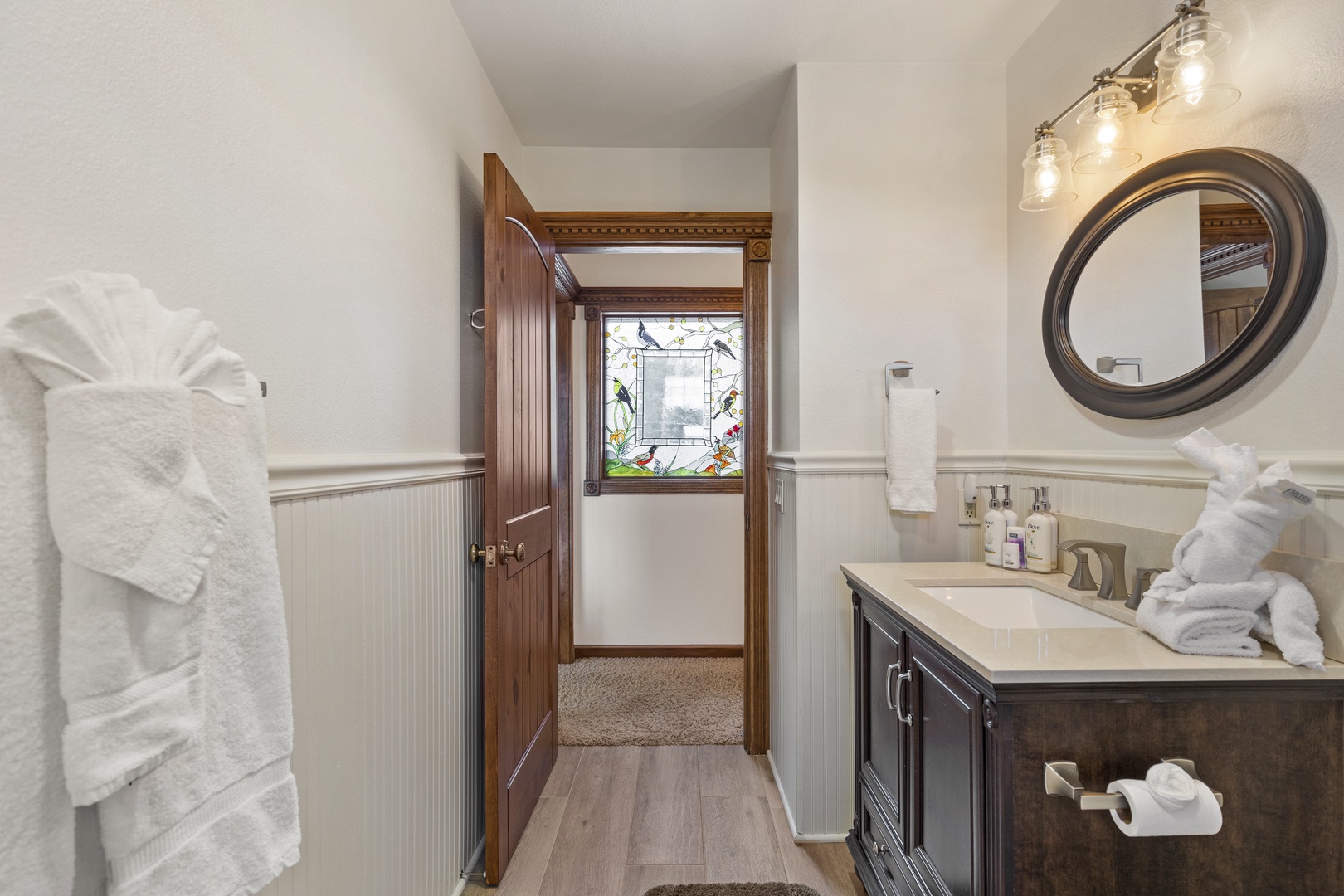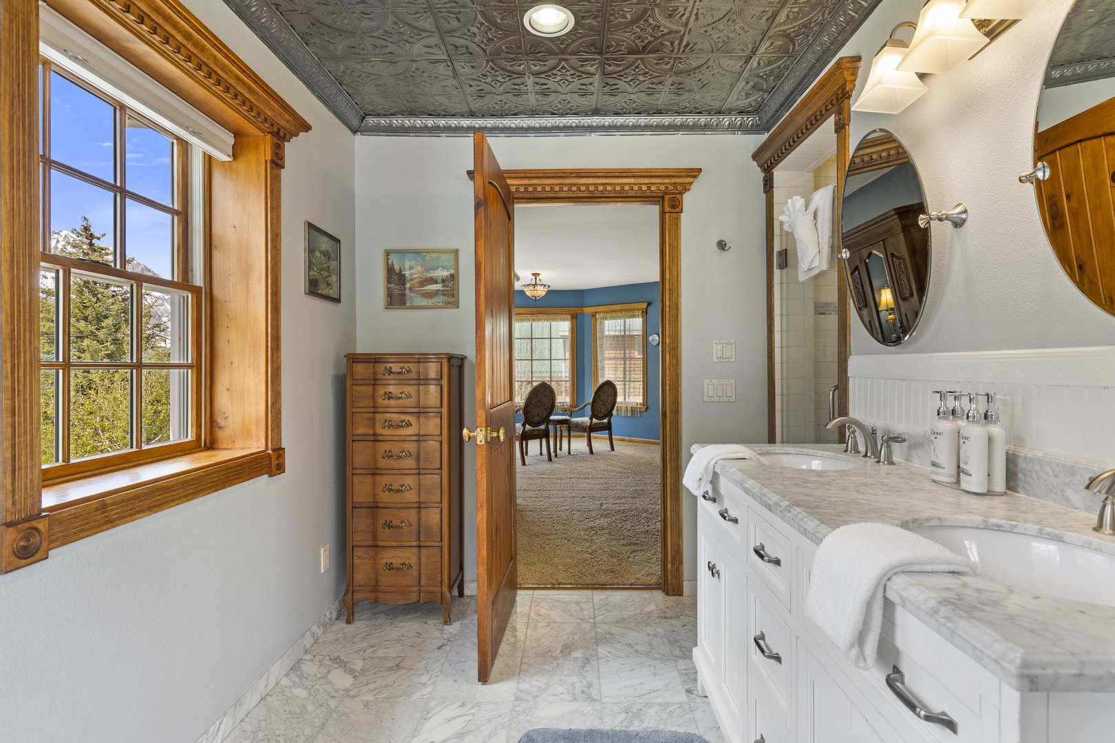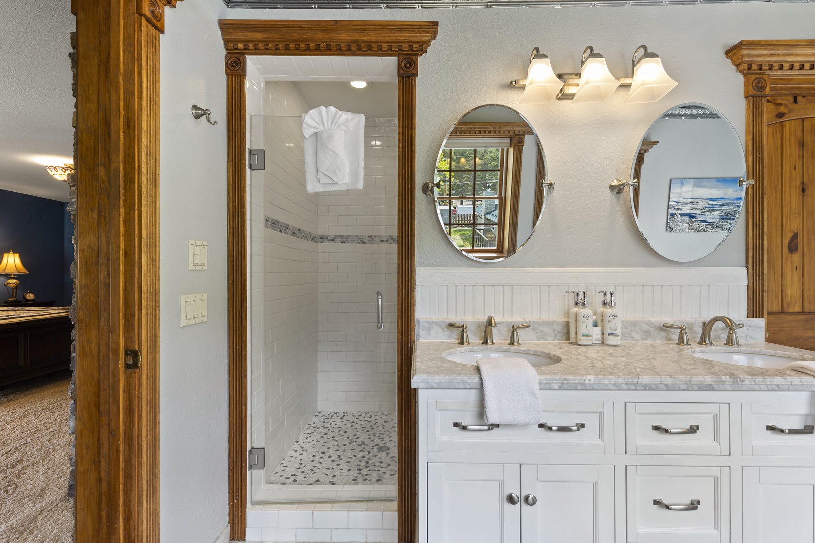 Head upstairs to the upper level of the home to relax in the spacious master suite. This suite offers a king bed, a fireplace, and a sunny lounge area, creating a tranquil retreat for your stay. Connected to the master suite is a full bathroom with his and her sinks, a bathtub, and a separate shower.