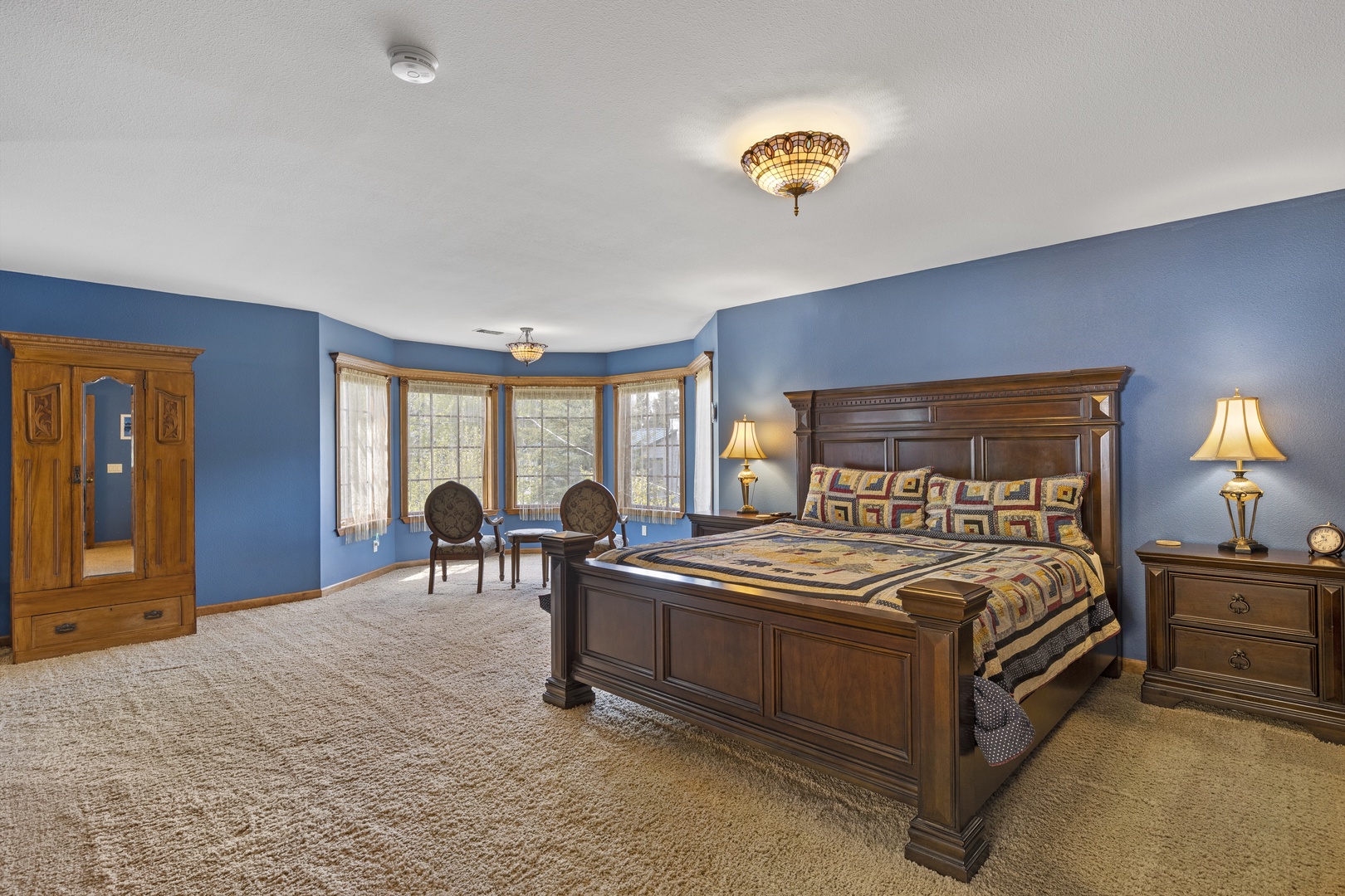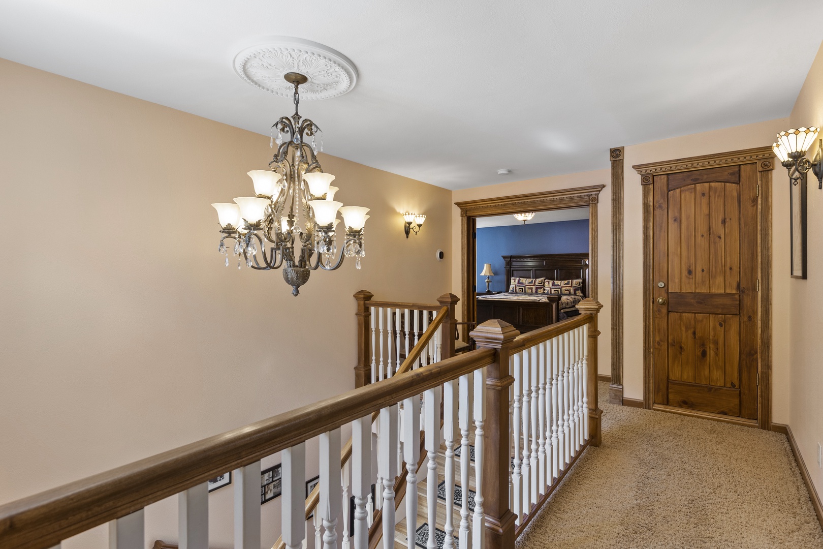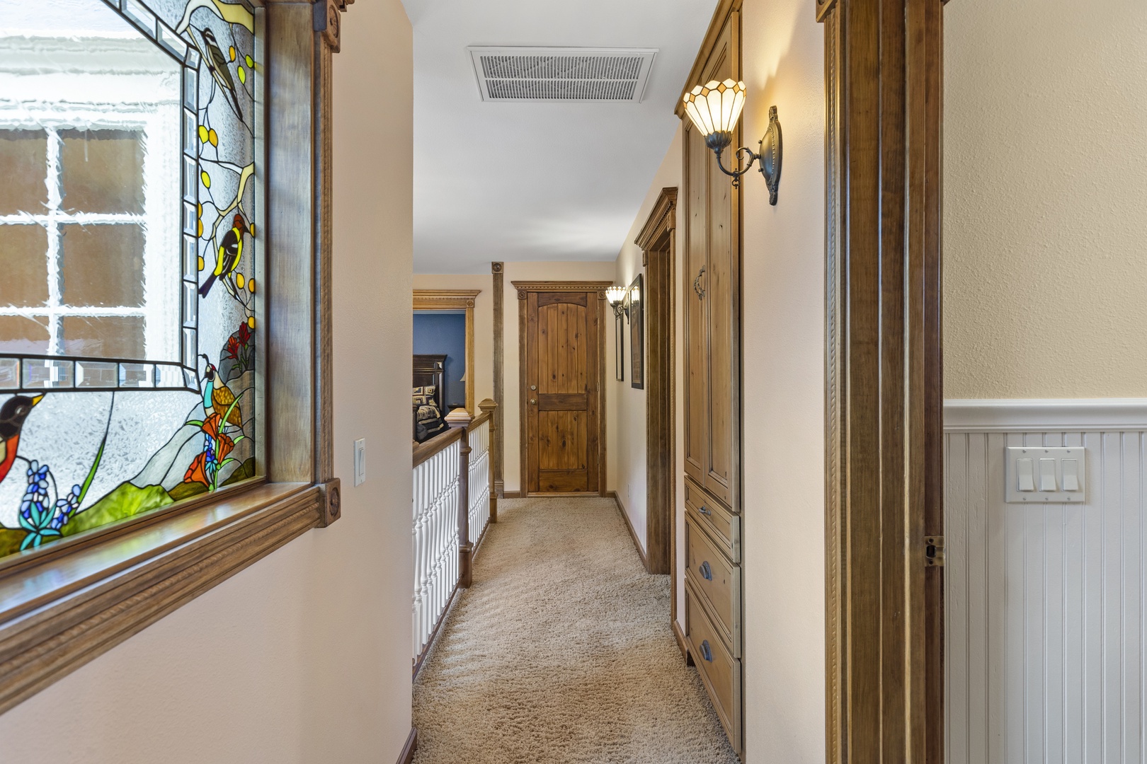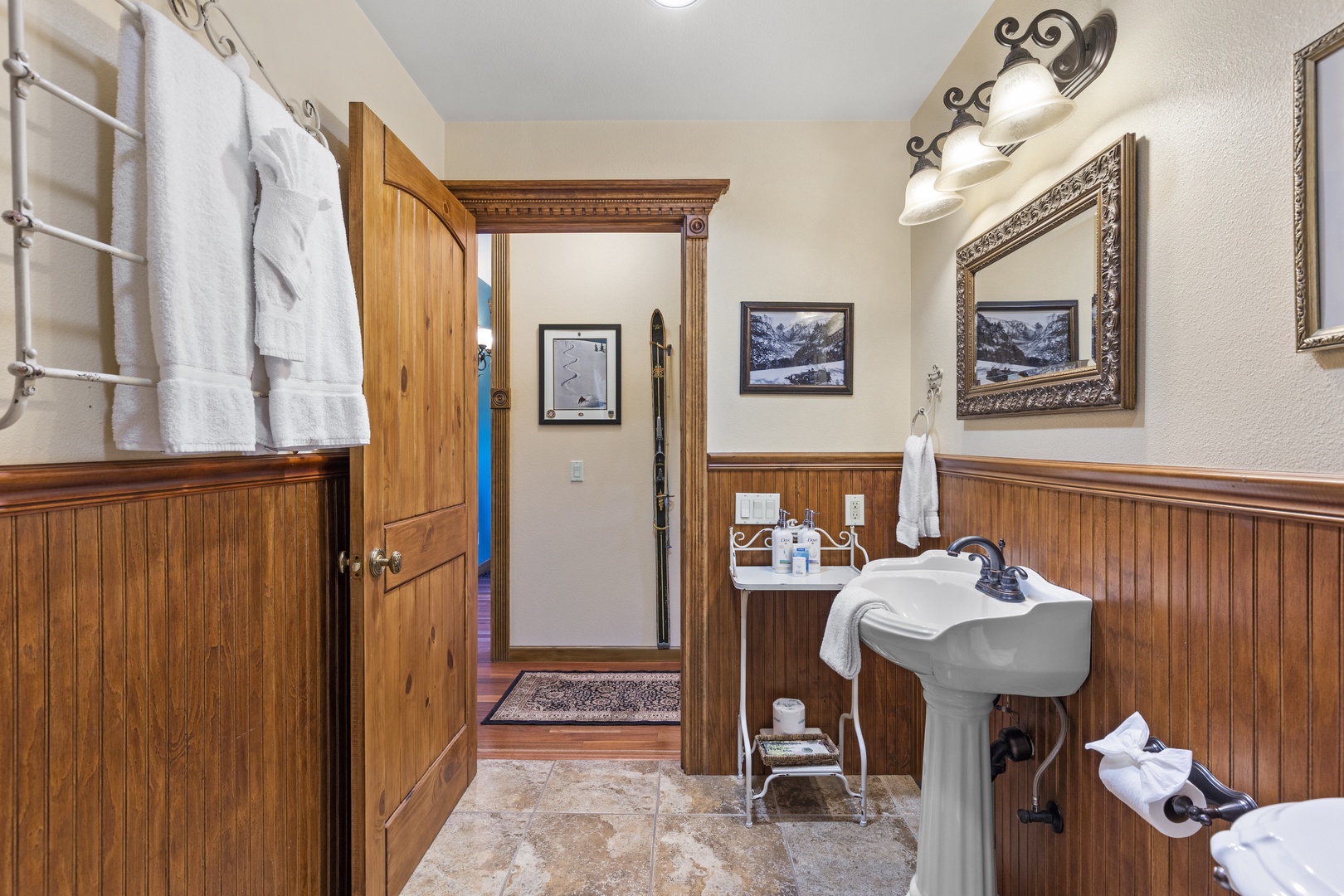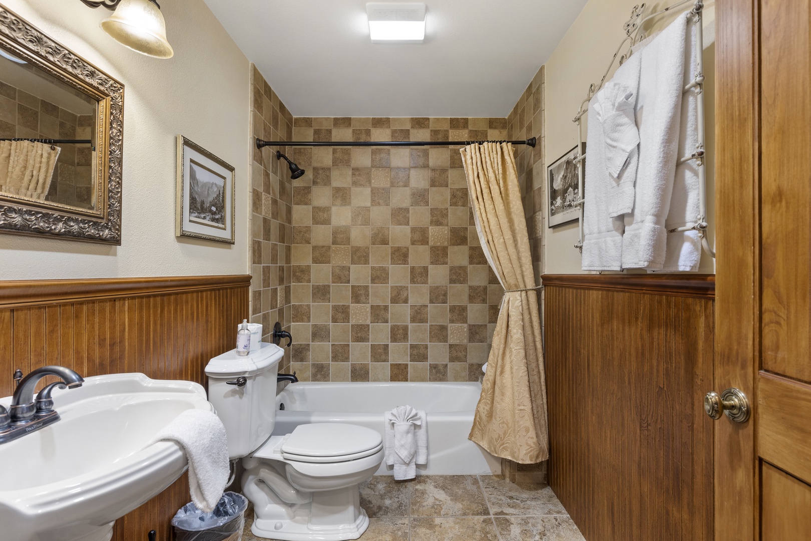 Head upstairs to the upper level of the home to relax in the spacious master suite. This suite offers a king bed, a fireplace, and a sunny lounge area, creating a tranquil retreat for your stay. Connected to the master suite is a full bathroom with his and her sinks, a bathtub, and a separate shower.