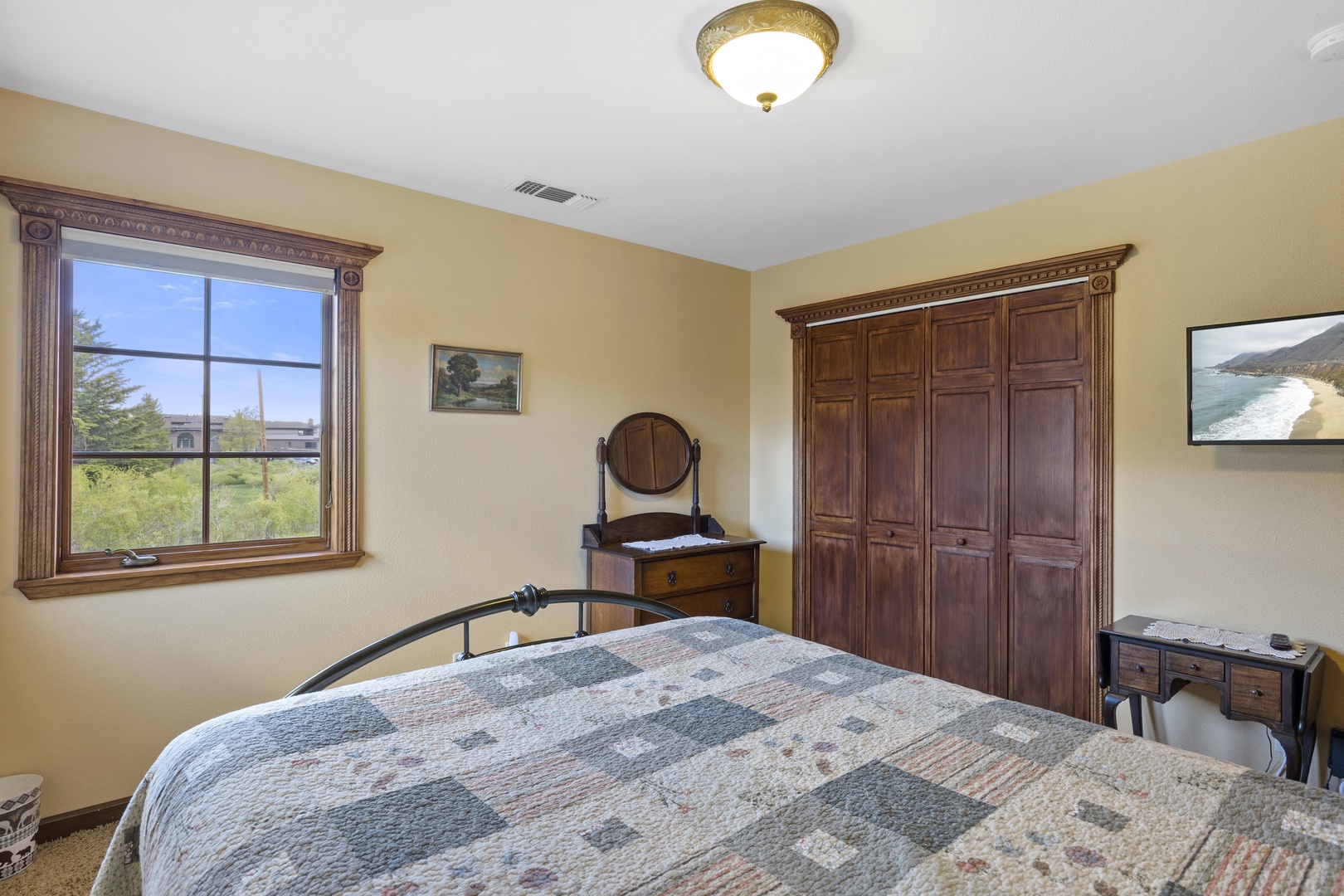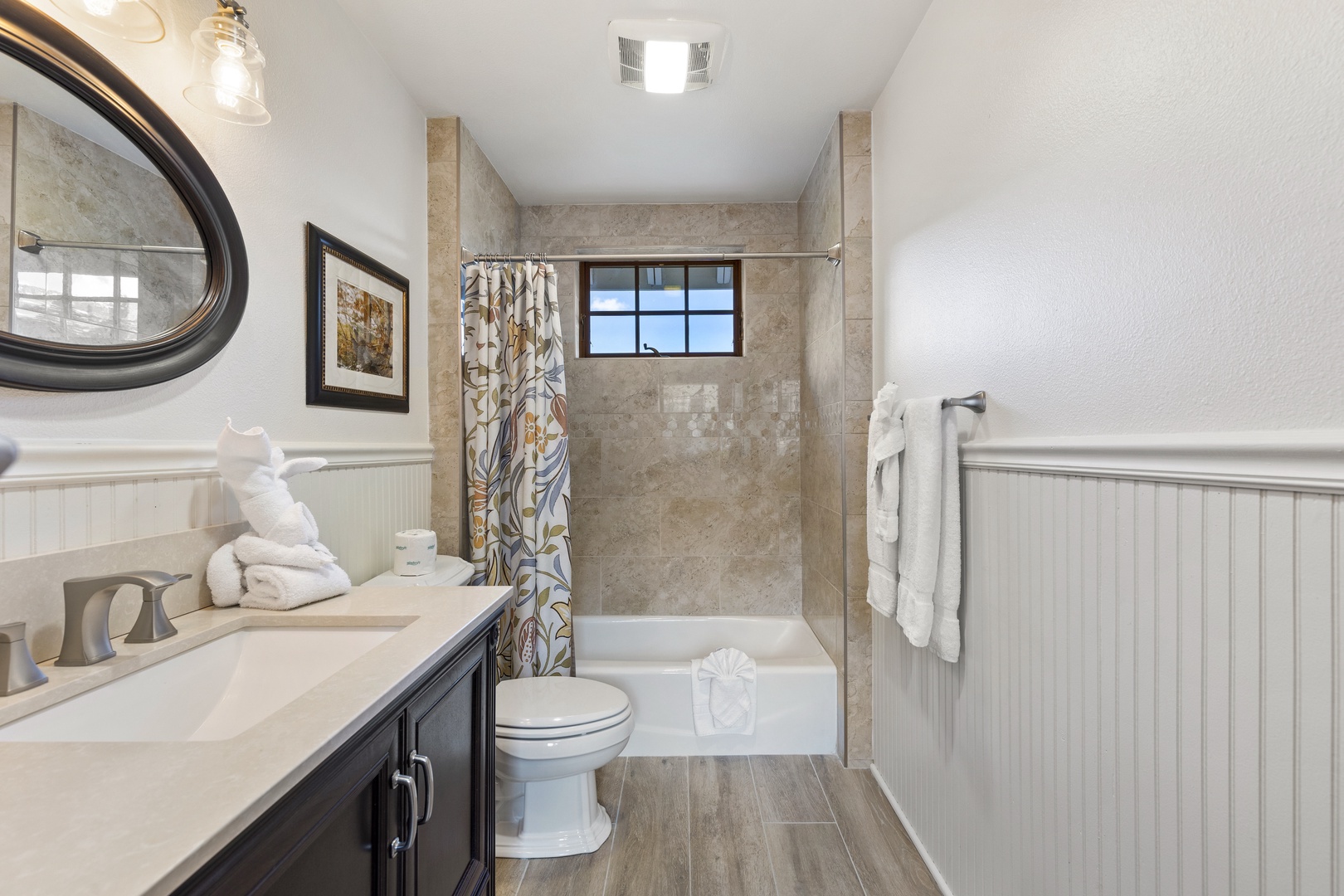 In addition to the master suite, the upper level hosts two more comfortable and bright bedrooms, each equipped with a queen-sized bed and ample storage space. Another full bathroom on this level adds to the convenience of your stay.